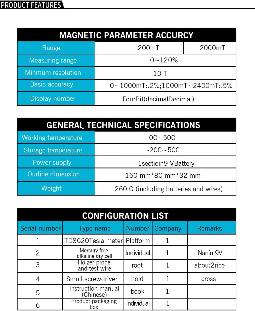 CGOLDENWALL CGOLDENWALL is a manufacturer specializing in Tesla Meter, we will provide to you the English Instruction and Professional Service. Features: 1.The design of TD8620 hand-held digital Tesla meter follows the IEC-61010-1 safety standard. 2.It conforms to the national verification regulation of JJG242-1995 Tesla meter. 3.It adopts not only the high-sensitivity Hall sensor and high-resolution A / D conversion chip, but also the popular single-chip computer technology and digital filtering technology . 4.It has the advantages of high sensitivity, stable reading, low power consumption , and light weight. Specification: 1.Range: 200 mT 2000 mT 2.Range of Measurements: 0 ~ 120% 3.Minimum resolution: 10uT 4.Basic accuracy: 1000mT~2400mT:±5% 5.Number of digits displayed: 4 bits (Decimal) 6.Power supply: one 9 V battery(battery not included) 7.Working temperature: 0℃ ~ 50℃ 8.Storage temperature: -20℃ ~ 50℃ 9.Shape size: 160 mm × 80 mm × 32 mm 10.Device weight: 260 g (including batteries and wires) 11.Longitudinal Hall probe, wire length is about 2 meters NOTE: Thank you for choosing us! All products sold by our company, we will enjoy the strict assurance of the quality and excellent service, you can feel comfortable to buy and use.