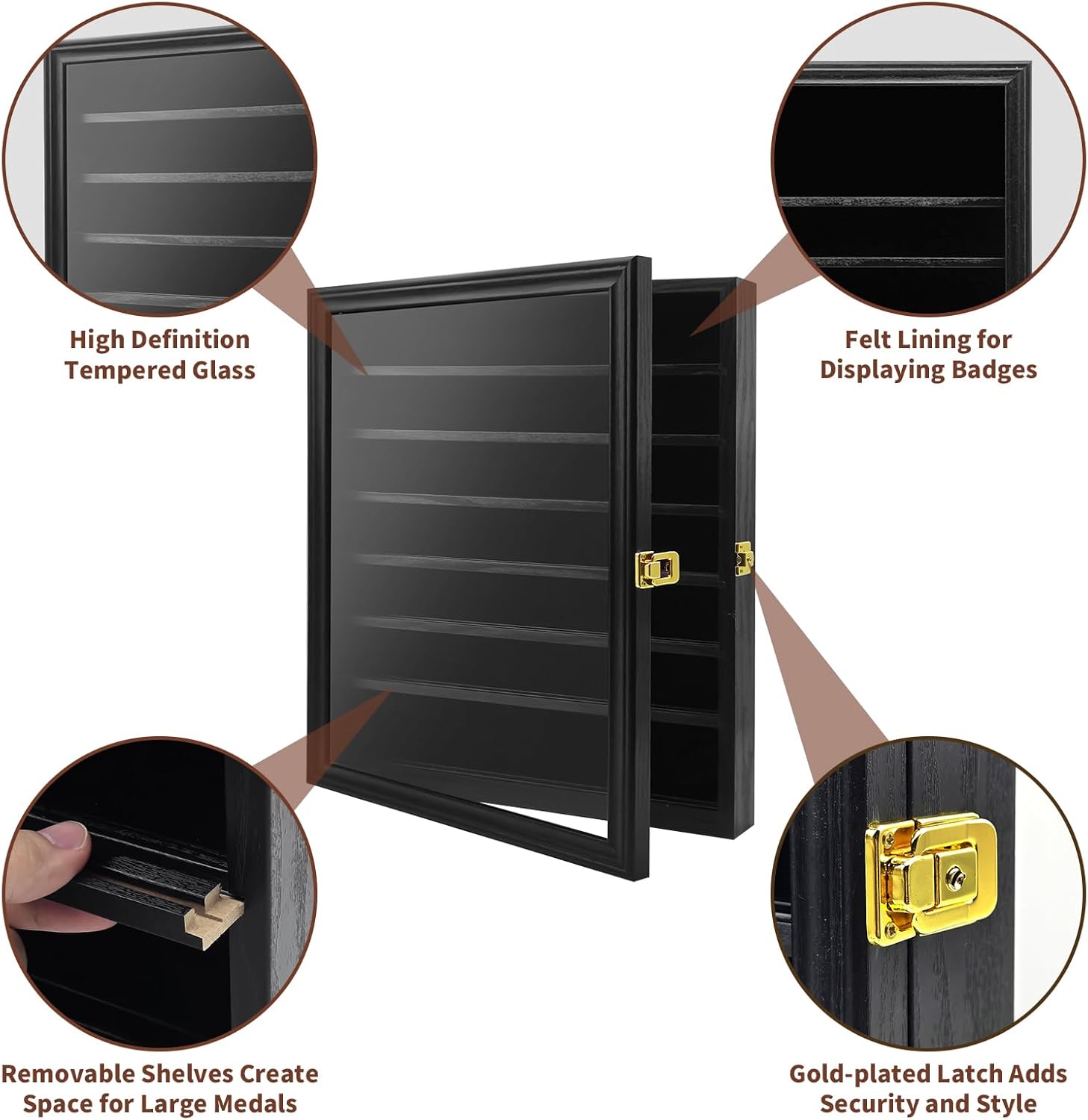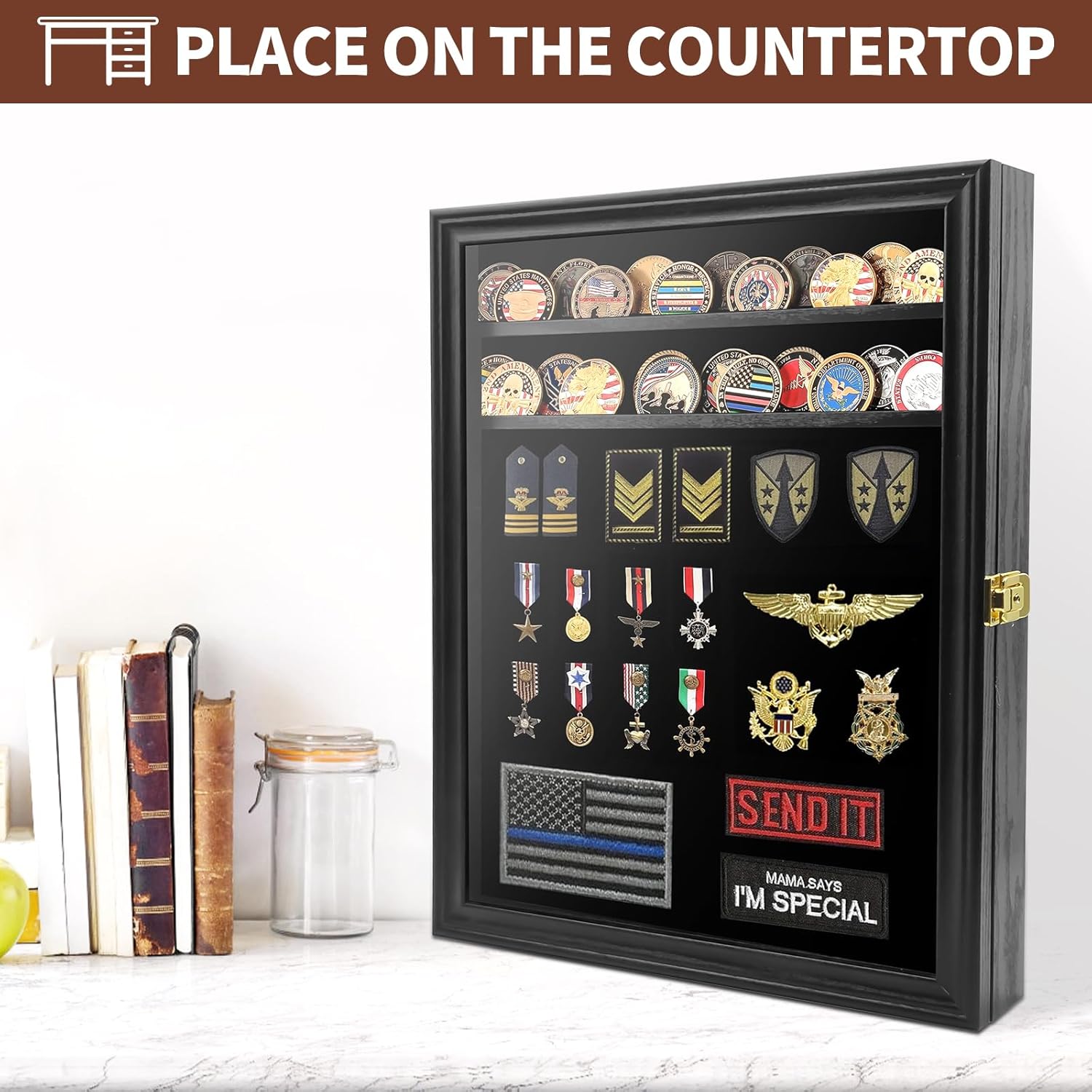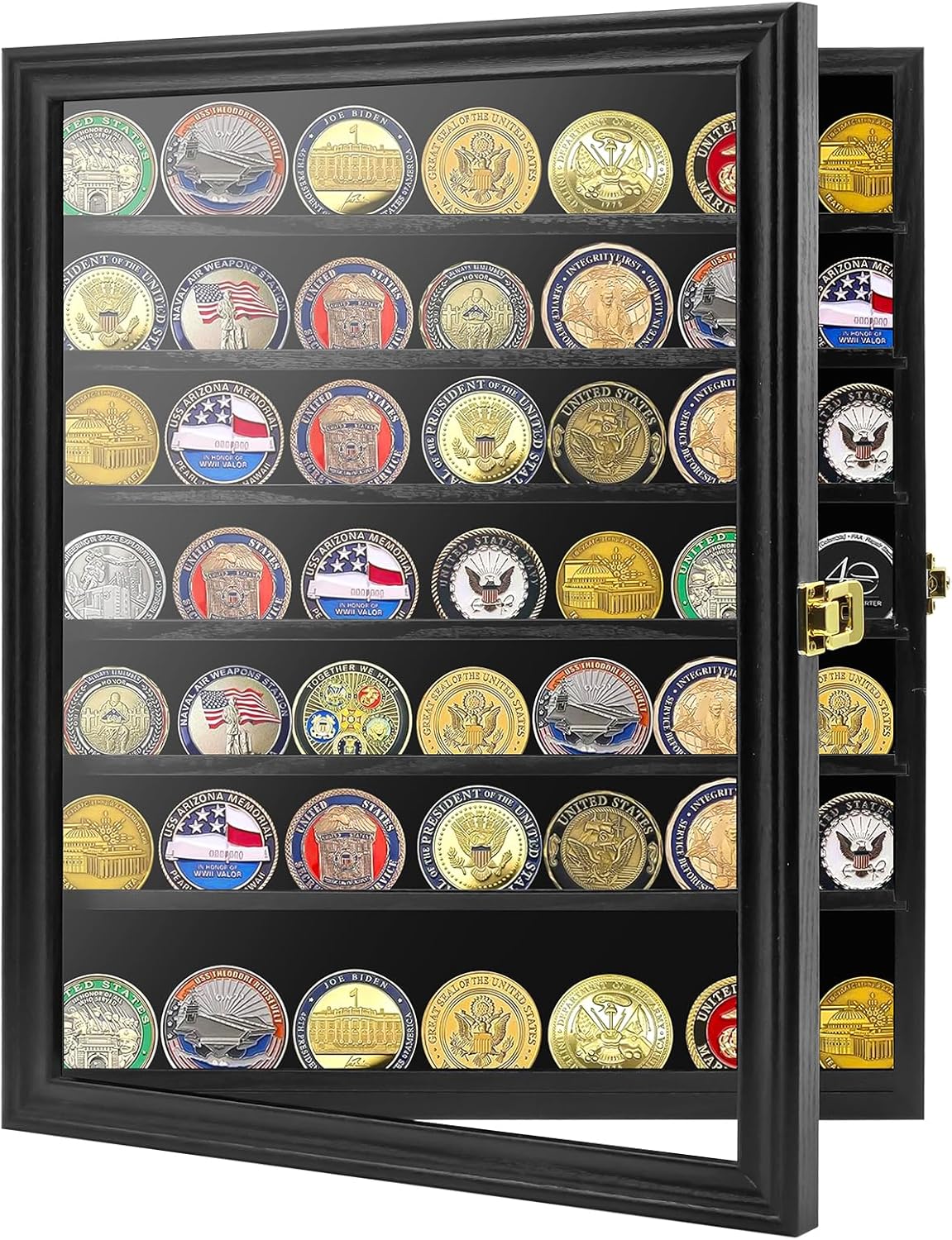 Showcase your achievements with a display designed to honor every detail. This large challenge coin display case is built for collectors who want more than simple storage. With a 7-row tiered structure, removable shelves, and a pinnable felt background, it allows you to organize and present challenge coins, medals, pins, badges, ribbons, and insignia in one refined shadow box. The solid wood construction with reinforced joints provides long-lasting durability, while the smooth polished finish enhances the overall presentation. A lockable door combined with a UV-resistant acrylic panel helps protect your collection from dust, scratches, and fading, ensuring your items remain in excellent condition over time. Designed for versatility, the adjustable layout allows you to customize your display based on your collection. Whether you are showcasing military coins, service medals, or personal memorabilia, this cabinet creates a clean, structured, and professional presentation. Perfect for wall mounting in offices, homes, or dedicated display spaces, this case transforms your collection into a meaningful visual centerpiece. It also makes a thoughtful and memorable gift for veterans, active service members, and collectors who take pride in their achievements.