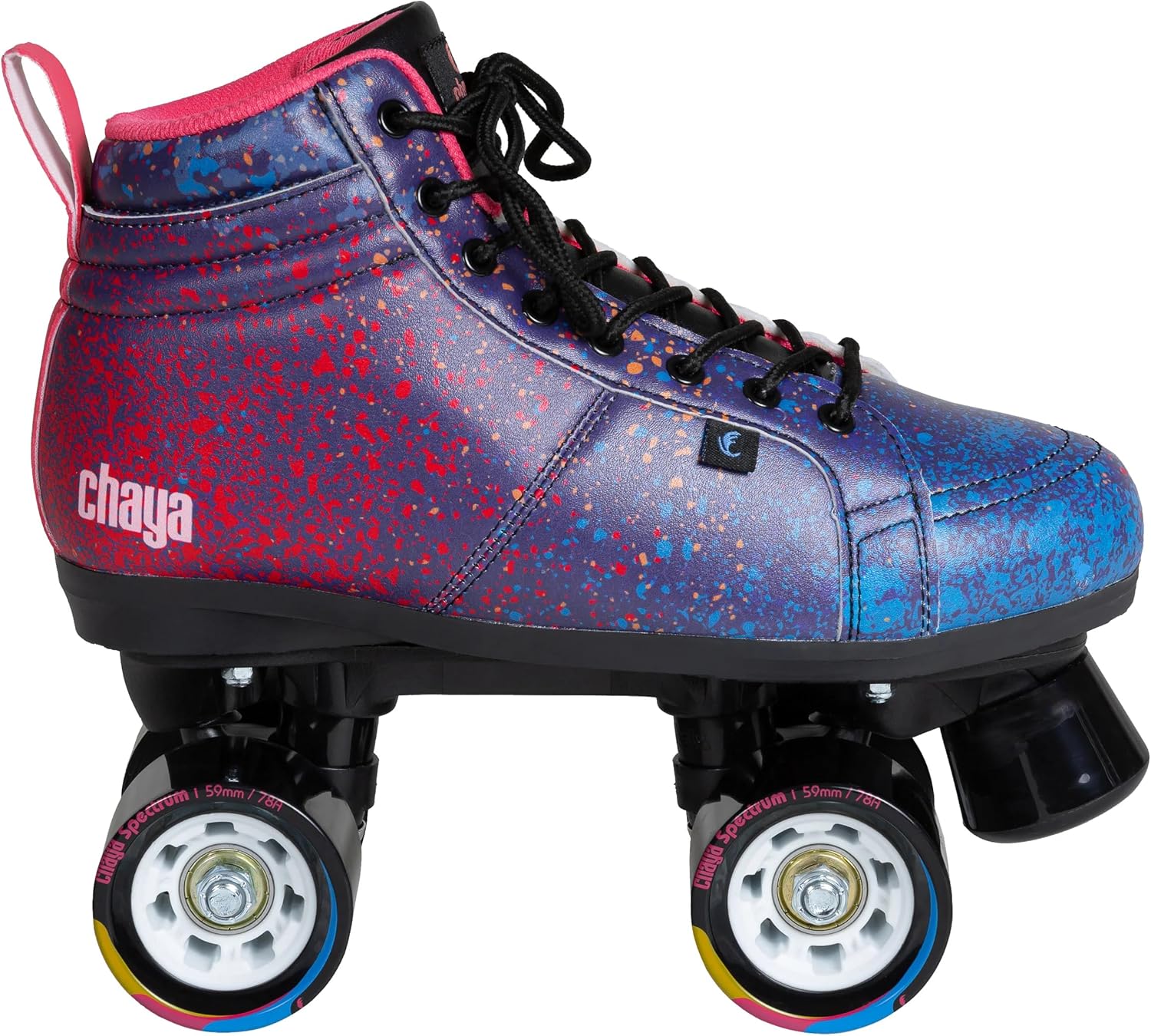 The Chaya Airbrush is a playful colored skate developed with maximum comfort and tons of fun in mind! This fully vegan mid-cut boot benefits from a great fit and an EVA insole for ultimate comfort. Mounted to the light weight, glass-fiber reinforced Chaya Aja plate for strength and response, this is the easy and smooth ride you are looking for at the roller disco, on the street or beach. Gliding on Chaya Spectrum outdoor wheels (78a, 59mm) and Wicked ABEC 7 bearings, this is the ultimate package for all of your retro roller skating dreams.We highly encourage using the European sizes for the most accurate sizing!*Please refer to the size charts! Skate boots are not always the same size as your street shoes. Measuring your foot and comparing to the size guide is the only way to know what size will fit you. Keep in mind that your skates should fit snuggly. It's really important that when you measure your foot you back your foot up against a wall and draw a half circle around the top of your foot. Then use a tape measure to measure the longest part of your foot. Millimeters off makes a huge difference so don't be afraid to measure twice! When in doubt go up in size rather than down!