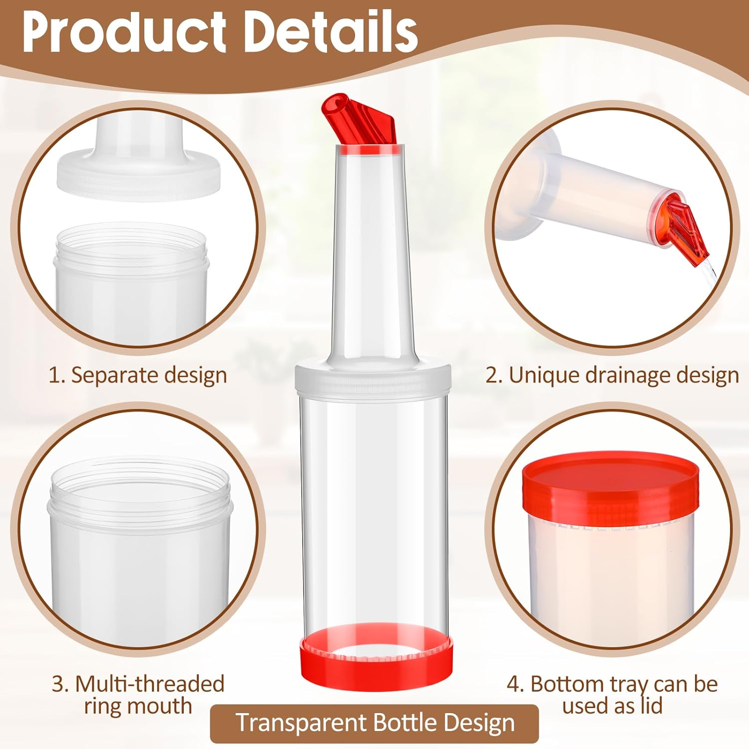 Features: Equip your home bar with tools from bartender: The 34 oz containers are all clear so that you can see how much is left in the bottle from a distance. They are individually color coded. This will make your mixing more efficient. High capacity containers: Holds up to 34 oz of fluid, nice for pouring and storing mix juices without worrying what to do with any leftovers. Simply put the bottom lid on and refrigerate. Leak proof: Leak proof and easy to clean. Simply remove the spout and lower part to rinse under warm water. Versatile: Can be applied to mixed juices, liquor or syrup and other thick fluids thanks to the wide spout. Nice for any home bar and at parties. Easy to clean and store: When its time for storing, simply detach the upper part and close the container with the lid to keep the freshness. To clean, rinse under running lukewarm water. The 12 juice bar bottle set includes: 6 Color top: white, orange, red, yellow, blue, green Bottle dimension: 3.7 inches, 13inch height Package includes: 12 x Juice pouring bottles Notes: Manual measurement, please allow slight errors on size. The color may exist a slight difference due to different screen displays