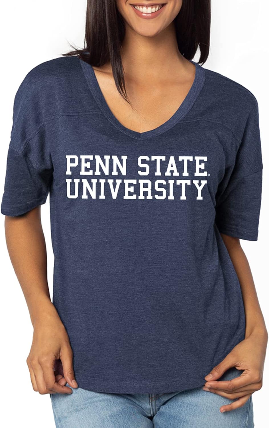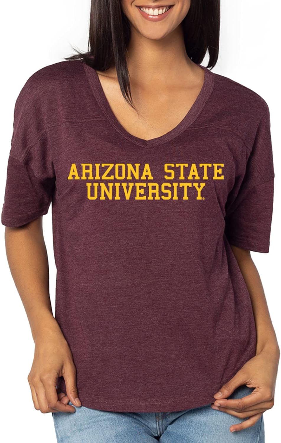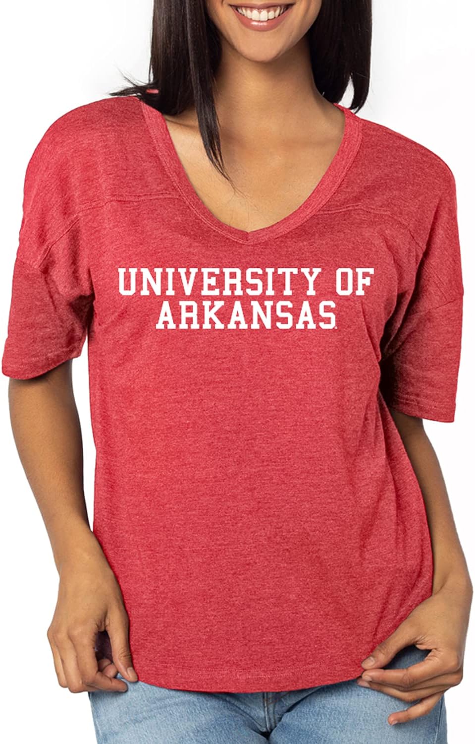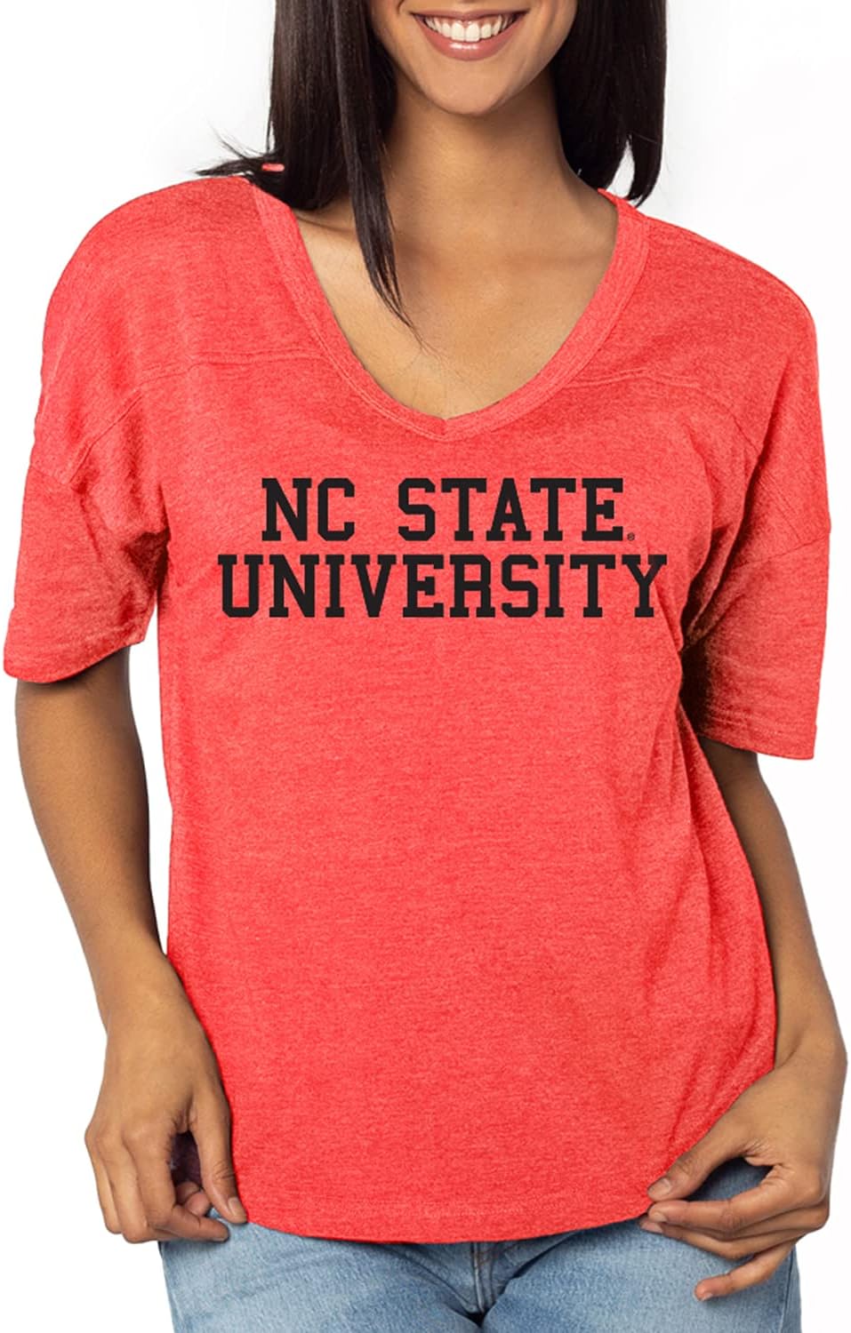 Look ready for game day in this jersey inspired silhouette. Feminine details include a rounded hem, yoke, v-neckline and longer short sleeves. Support your favorite team while staying on-trend with the NCAA officially licensed graphic.