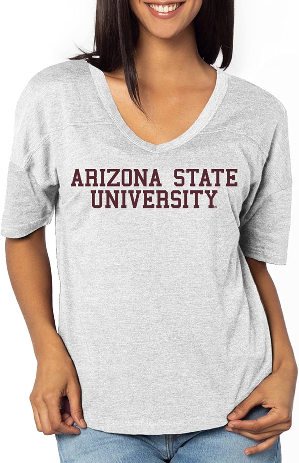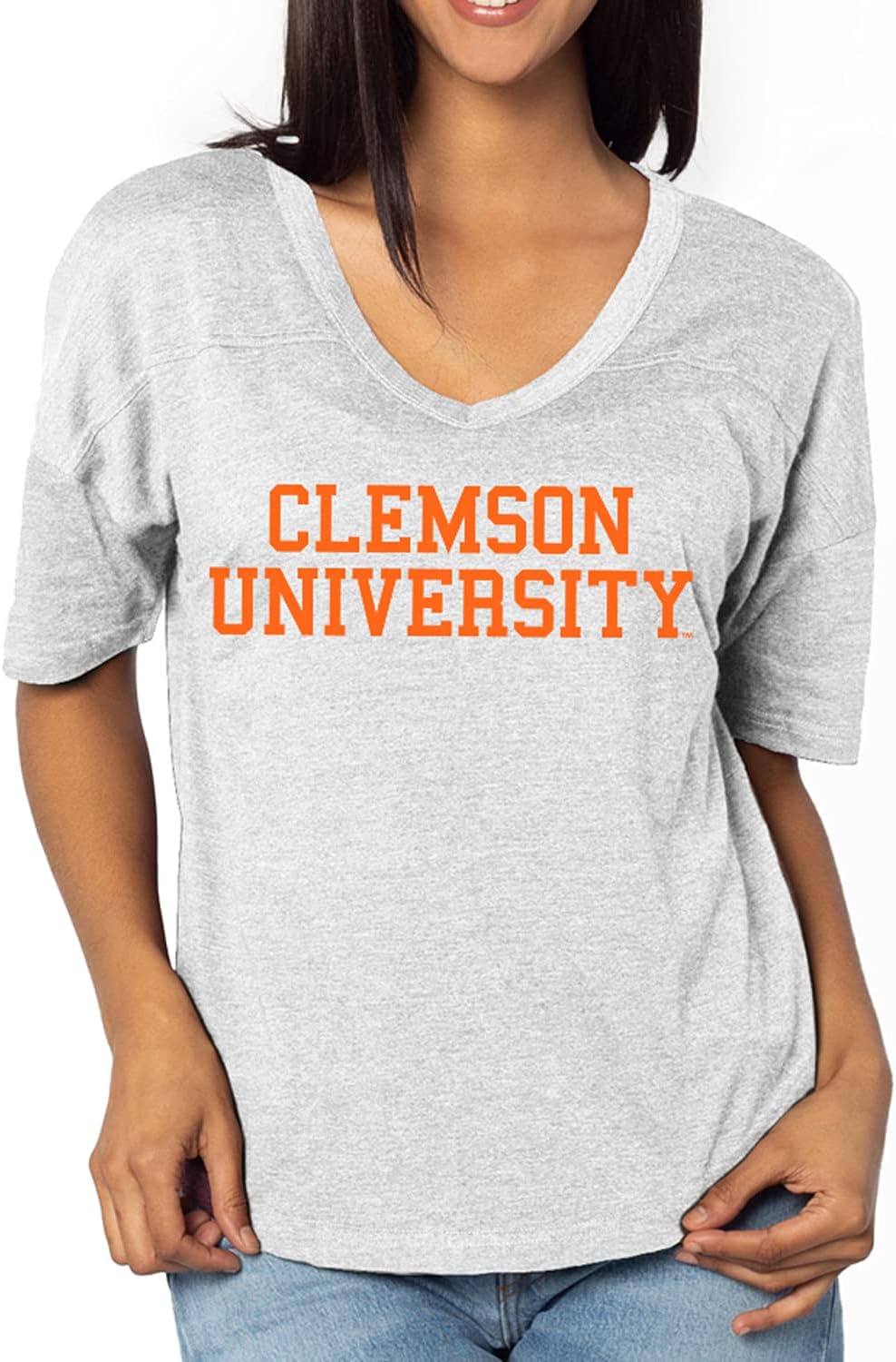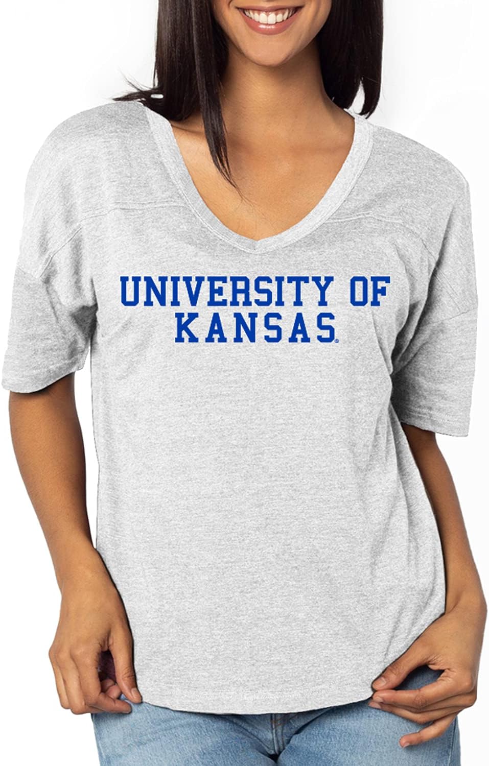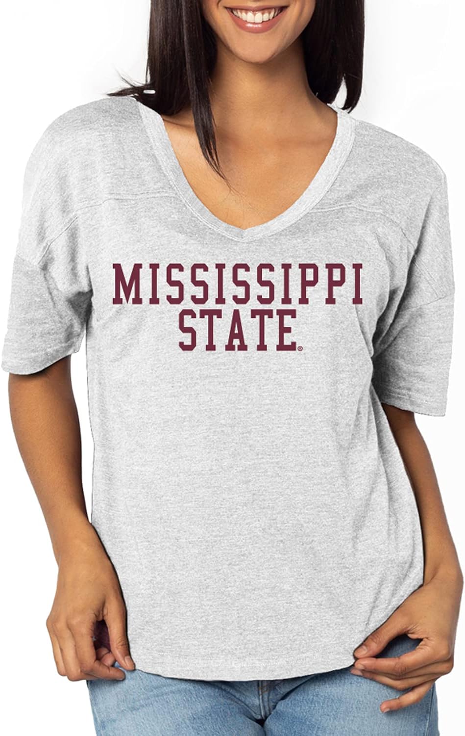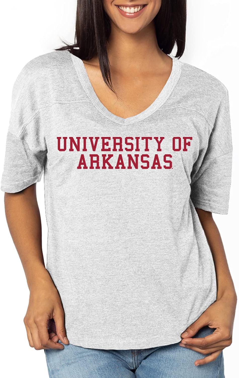 Look ready for game day in this jersey inspired silhouette. Feminine details include a rounded hem, yoke, v-neckline and longer short sleeves. Support your favorite team while staying on-trend with the NCAA officially licensed graphic.