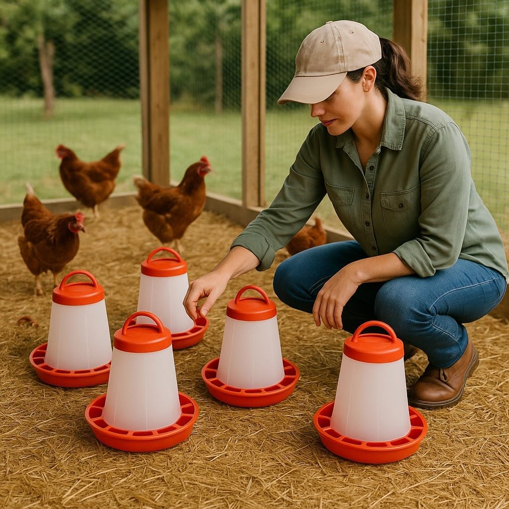 Elevate your poultry farming with this comprehensive 5-piece chicken feeder set. The collection includes various sized feeders with capacities up to 3kg, perfect for flocks of different sizes. Each red and white feeder features thoughtful design elements including a convenient carrying handle, easy-access feed ports, and a large base tray that minimizes waste. The innovative construction prevents feed spillage while allowing multiple birds to feed simultaneously through well-spaced ports. These durable plastic feeders are engineered for quick two-piece assembly, with removable containers that make cleaning effortless. The wide-base design ensures stability, preventing tipping during use. Perfect for both backyard coops and larger operations, these feeders provide reliable feeding solutions with their sturdy construction and practical features. The varying sizes allow for strategic feed placement throughout your coop, while the secure lids protect feed from moisture and pests. The set's modular design accommodates different feeding zones, making it an essential addition to any poultry farming setup.