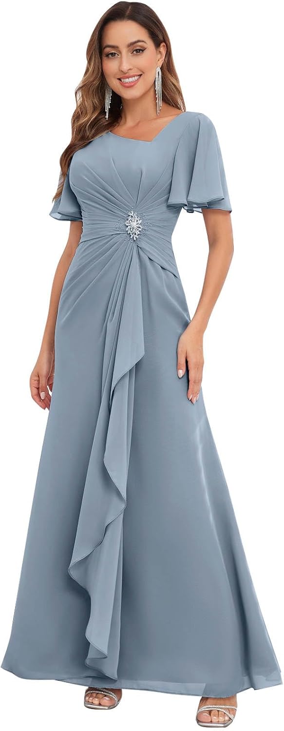 Fabric: Chiffon Mother of The Bride Dress. Silhouette: A Line Wedding Guest Dress. Back Closure: Lace-up, Drawstring, Corset Evening Dresses. Neckline: V Neck Mother of The Groom Dress. Sleeve Style: Short Flutter Sleeve Bridesmaid Dresses. Hemline: Floor Length Grandmother of The Bride Dresses. Features: Chiffon Mother of The Bride Dresses with Sleeves, V Neck Ruffles Beaded Ruched Sheath Long Formal Dress. Occasions: Perfect as mother of the bride dresses, mother of the groom dresses, bridesmaid dresses, prom dresses, evening dresses for women, wedding guest dress, pageant dress, engagement dress, homecoming dress, cocktail dress, black tie dress, festival, birthday, holiday, party ball gowns. Perfect for other formal or semi-formal special occasions. Size: To ensure the dress will fit you, please check detailed measurements on the size chart and choose the right size. (Size chart follows dress images.) If you want the dress to be customized, please send us below measurements. 1.Bust ___ inch or ___ cm 2.Waist ___ inch or ___ cm 3.Hips ___ inch or ___ cm 4.Height (barefoot) ___ inch or ___ cm 5.Shoulder to floor (barefoot) ___ inch or ___ cm 6.Heels ___ inch or ___ cm (or flats) Warm Tips 1.The real color of the dress may be slightly different as the computer screen is different. 2.Please allow 1-3cm differs due to manual measurement.