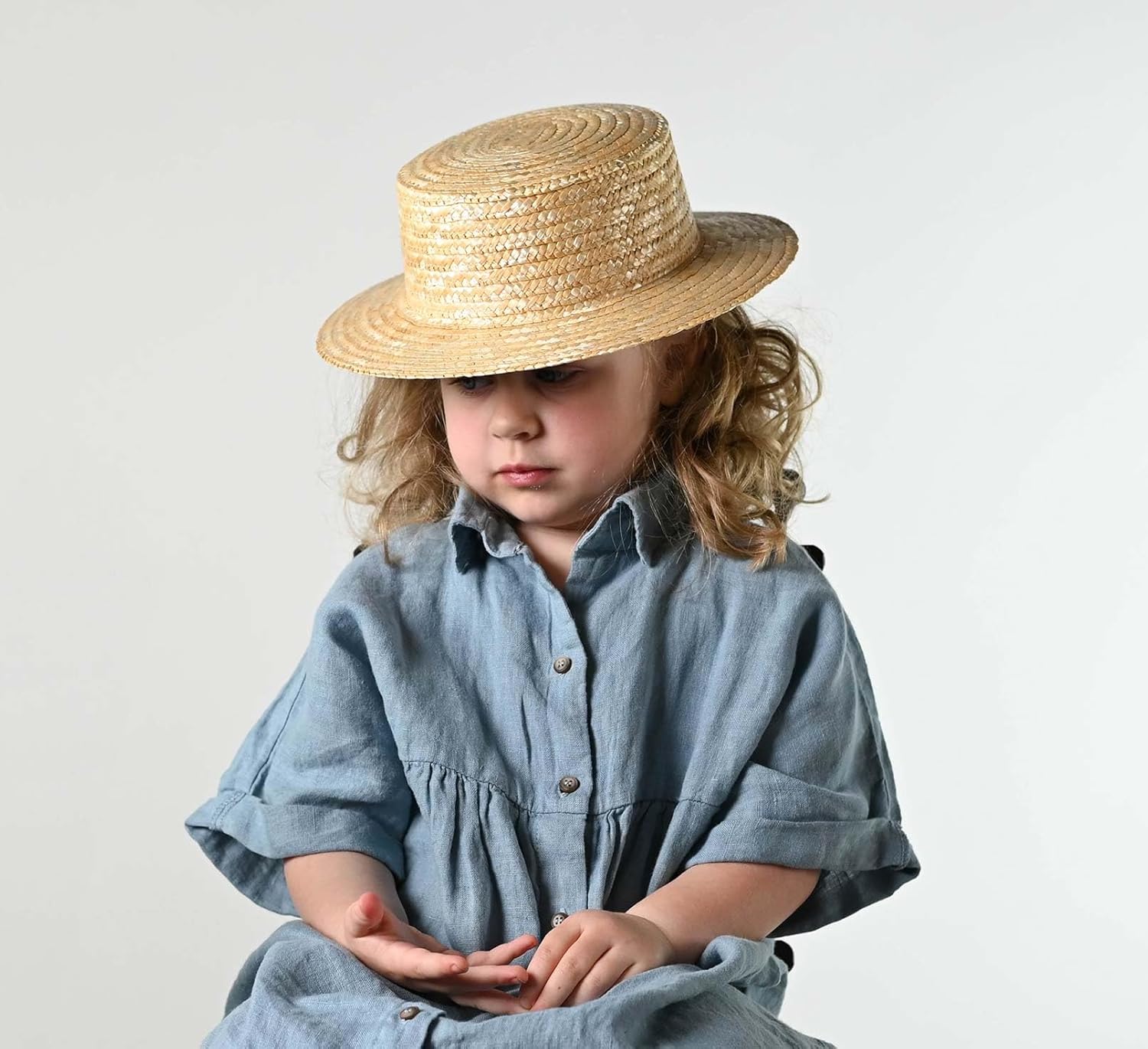 Made in our workshopChildren's HatChin strap100% Natural strawMade in ItalyBrim: 4.5 cmHeight: 7 cmTraditional making from a straw braid placed on a turnstile.The finesse and rigidity ensure the quality of the boater, which must be enough rigid to keep the good style and a right angle between the crown and its brim.Advice for sizeSimply measure the circumference of your head holding the measuring tape snug, but not too tight. Just above your ears - which is right about where your hat will sit. No measuring tape? No problem. Cut a 30'' piece of string. Use the string to measure your head, then measure the length of string used.