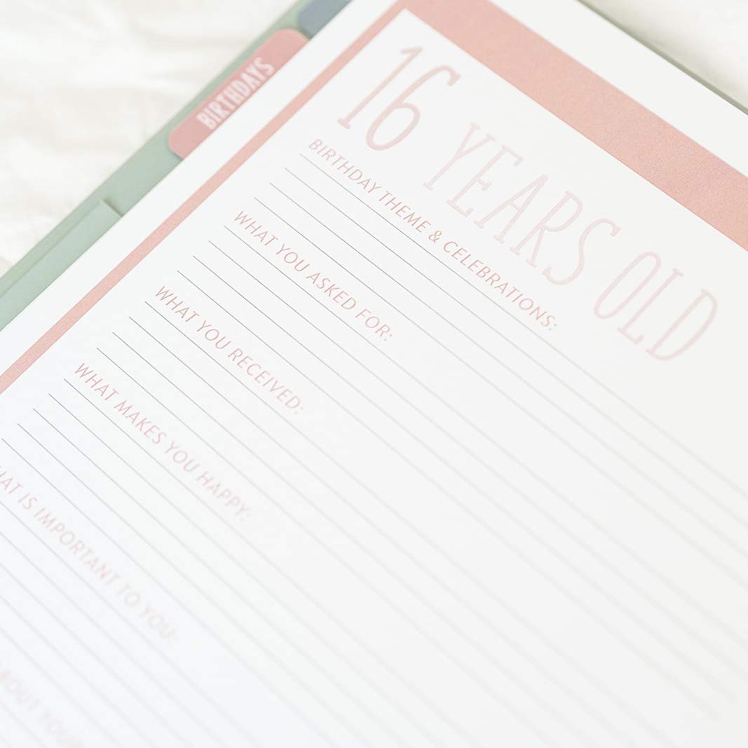 This guilt-free, simple Childhood Memory Book is perfect to record your child's memories from birth, through school days, birthdays and more will make you the queen of memory keeping. (And leave you with the most beautiful gift to give when your child graduates!) Time flying by? Don't let those special childhood moments pass you by! Start when your baby is new, or jump in when your child is a little older. The simple prompts will help you to record your priceless thoughts and memories of your child, without the overwhelm! This beautiful 8.5" x 11" Memory Book features: Hard, smooth Cover for durability Metal Corners to keep your journal in good condition throughout the years Small Coil Binding for easy writing on both sides of the book 120 Prompt Filled, Full Color Pages High quality, No-Smear Paper for seamless writing 6 Tabbed Sections with prompts for recording special memories 2 Pockets for Memorabilia Timeless Design to last **Colors may vary slightly due to monitor settings.