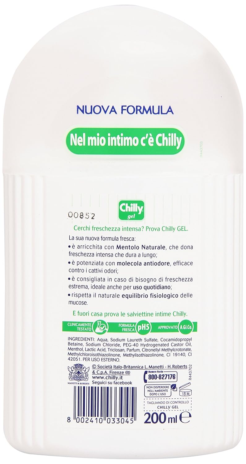 Chilly Gel is the intimate cleanser that gives freshness and intense security for a long time. Its fresh formula, enriched with natural menthol, has effective refreshing properties and helps to prevent the formation of unpleasant odors. Suitable for everyday use, it is ideal during the female cycle, when doing sport and on all occasions where there is a greater need for freshness. At pH5, without soap, respects the natural physiological balance of the mucous membranes. Clinically tested.