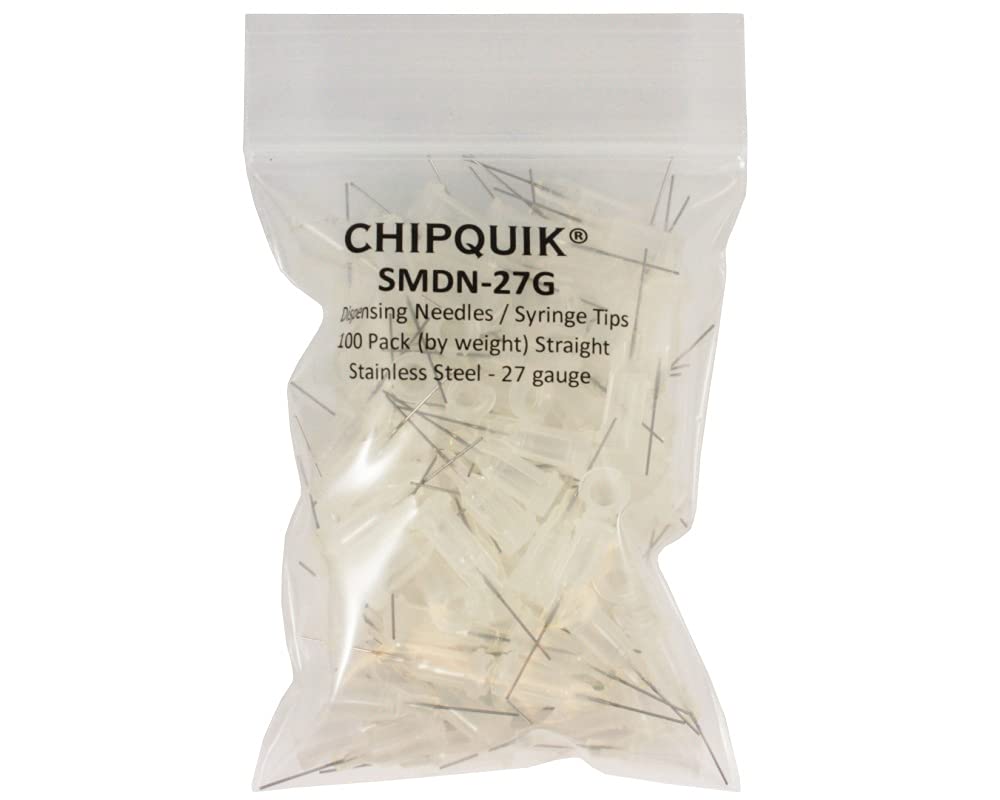 Industrial dispensing needle tips (Tip quantity counted by weight). Straight stainless steel, 12 to 27 gauge. 1/2" length. Fits most standard syringes, including 5cc, 10cc, and 30cc. Fits all Chip Quik syringes. Straight Stainless Steel Tips.