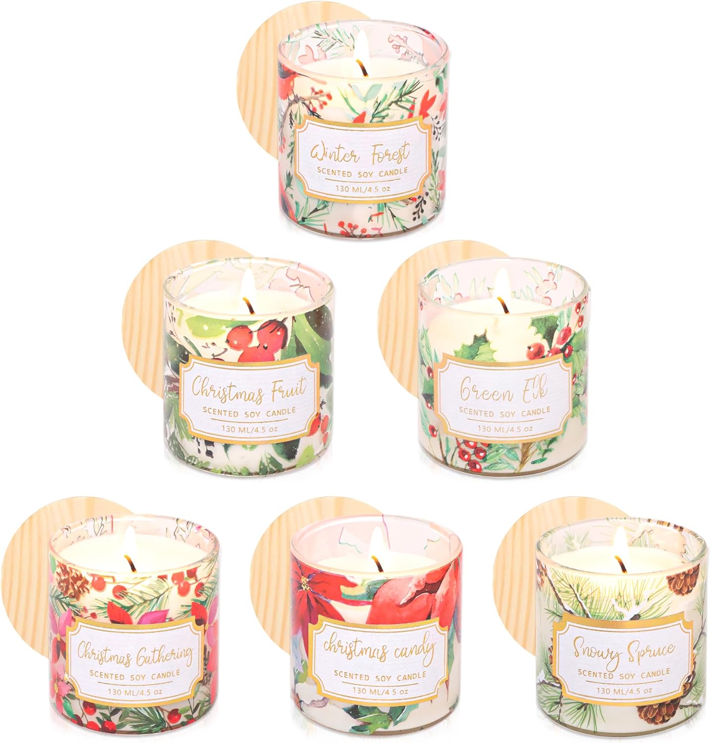 Christmas Jar Scented CandlesSpecification:Candle made of natural soy waxEach candle come with a lead free 100% cotton wick for a clean, smokeless burnSize: set of 6 candles, 2.4 x 2.4 inchesFragrance: Christmas Fruit, Christmas Candy, Green Elk, Winter Forest, Christmas Gathering,Snowy SpruceColor: Gen and RedBurning Time: 20+ hoursEach jar candle set is packaged with care in a protective storage boxWarm Tips: - Keep candle out of reach from children and pets- Do not leave burning candles unattended.- Do not use candles near flammable objects.- Discontinue use when 1/2" of wax remains at the bottom.