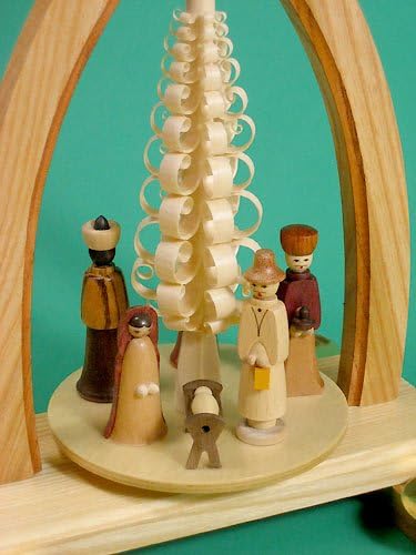 This Christmas Nativity German Pyramid is a fine mixture of woods to display the Nativity Figurines which spin around the shaved wooden tree. Made in Seiffen Germany this Christmas Nativity Carousel Pyramid uses 4 medium. candles to spin the carousel and stands about 9 1/2 inches tall. German Pyramids are great holiday decorations that will delight your guests and family.