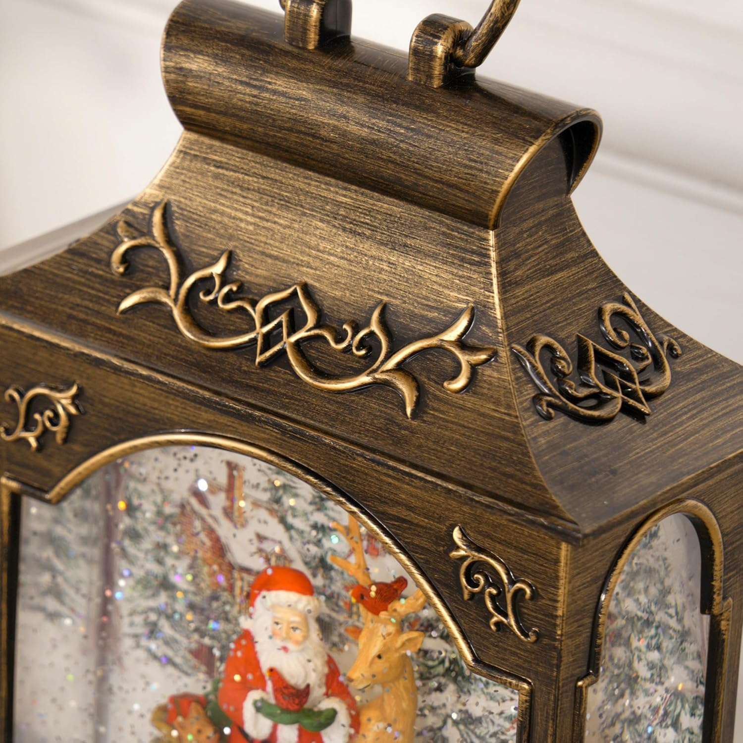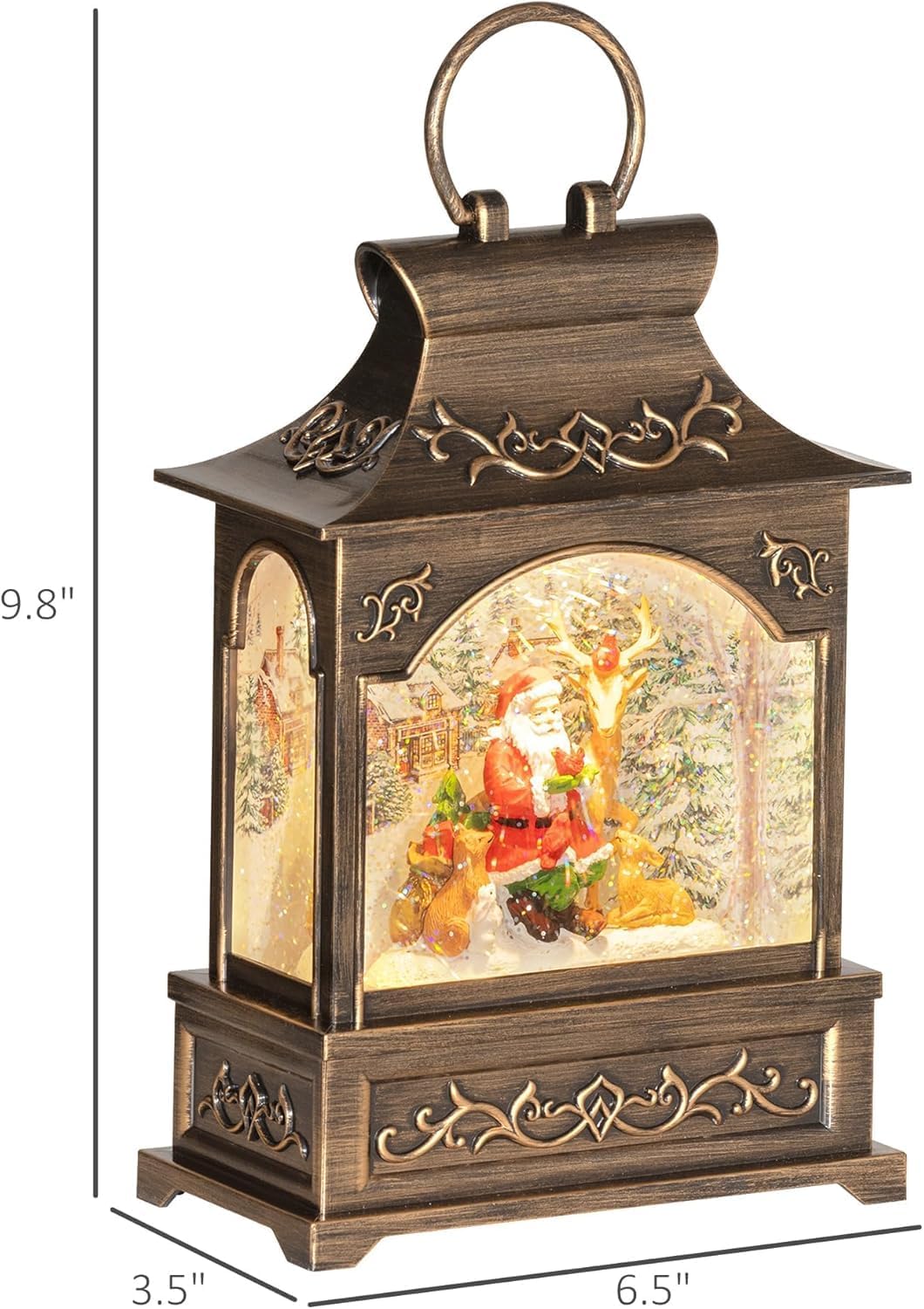 Enchanting Winter Scene: This Christmas lantern features Santa Claus with reindeer in a snowy forest, complete with fluttering glitter sequins it creates a classic winter scene Musical Lighted Delight: Enjoy eight classic Christmas tunes in a loop with this Santa snow globe.It's equipped with warm white lights.You can light it up with or without music via the switch on the bottom Crafted with Care: Made from quality acrylic and plastic, this light up snow globe is designed to bring holiday cheer for seasons to come Commemorate a Special Holiday with a Gift: A great decoration, this battery operated snow globe also serves as an exquisite gift to celebrate a milestone holiday.It's equipped with a top hanger/handle making placing or moving it more convenient Light up Snow Globe Info: Overall Dimensions: 6.5" L x 3.5" W x 9.8" H. 3 x AA battery required (not included).No assembly required