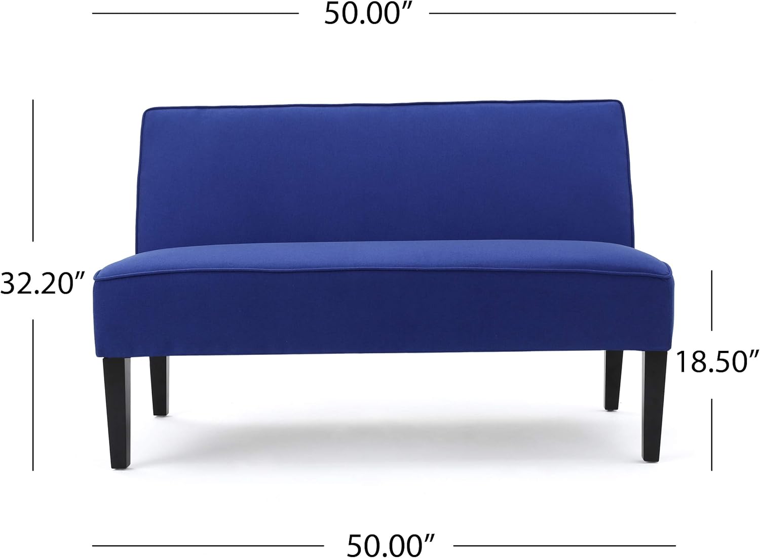 Includes: one (1) Loveseat material: Fabric, Fabric composition: 100% polyester leg Material: Birch color: Royal Blue leg finish: Matte Black some assembly required Dimensions: 30. 00”D x 50. 00”W x 32. 20”H seat Width: 50. 00” Seat depth: 20. 75” Seat Height: 18. 50”.