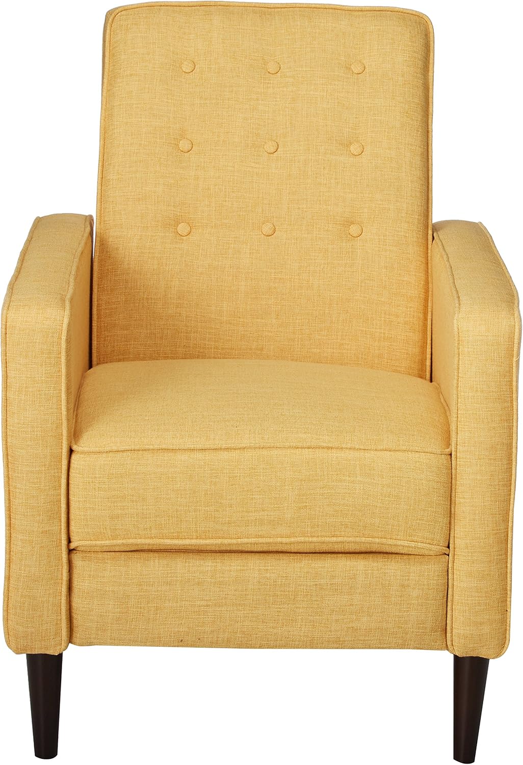 Looking for a place to prop up your feet and relax after a long day of work? Our mid-century modern recliners are a wonderful addition to any living room decor. Featuring clean lines and a smooth finish, these recliners offer you incredible comfort as well as sleek style. This is finished with lovely tapered legs for a sturdy structure and outstanding design. Complete with a beautifully button-tufted backrest and smooth upholstery for maximum comfort, these recliners will easily turn into your favorite place to unwind.Includes: One (1) ReclinerMultiple Material OptionsFabric and Microfiber Composition: 100% PolyesterLeg Material: Birch WoodMultiple Color OptionsLeg Finish: Dark EspressoAssembly RequiredDimensions: 34.25 inches deep x 27.00 inches wide x 38.00 inches highReclined Dimensions: 59.50 inches deep x 27.00 inches wide x 28.00 inches highSeat Dimensions: 21.50 inches deep x 20.00 inches wide x 18.50 inches highArm Height: 25.00 inches
