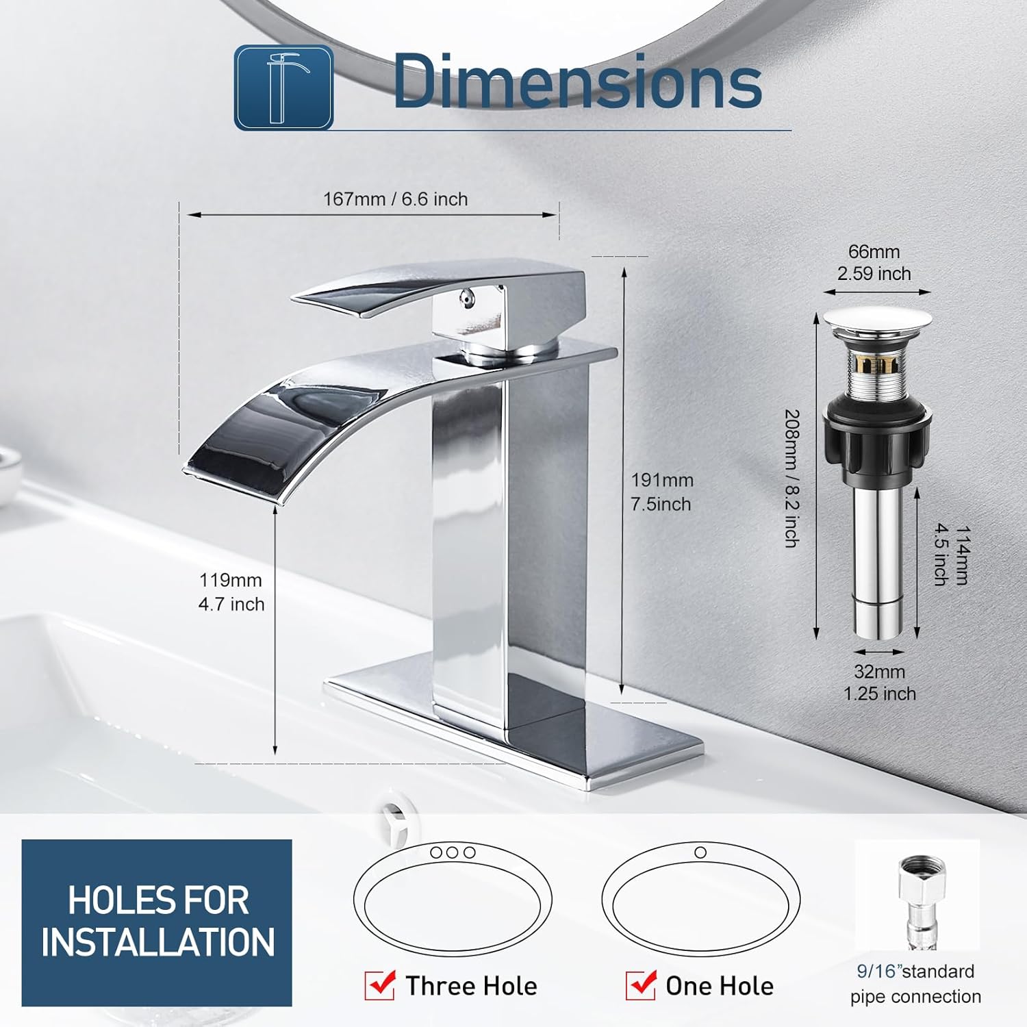 | Included Components | Bathroom Faucet, Drain, Fixed accessories, Water supply line |
