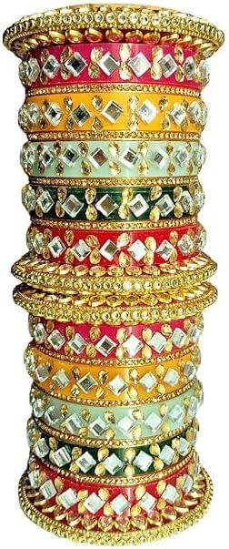 Multicolour Beauty: Vibrant Rajwadi Rajasthani Chuda set featuring a stunning array of colors, adorned with intricate Kundan work and a unique seep design. Versatile Elegance: Suitable for weddings, festivals, and special occasions, these bangles complement traditional Rajasthani and Indian outfits effortlessly. Quality Craftsmanship: Precision-crafted with high-quality materials for durability and comfort, reflecting the rich Rajwadi heritage. Complete Ensemble: The set includes various sizes and designs, allowing for easy mix-and-match to create a personalized and unique look. Cultural Fusion: A fusion of traditional Rajasthani aesthetics and contemporary design, symbolizing celebration and joy. Meaningful Gift: Ideal for brides, bridesmaids, or anyone who appreciates cultural jewelry, offering a thoughtful and graceful present.