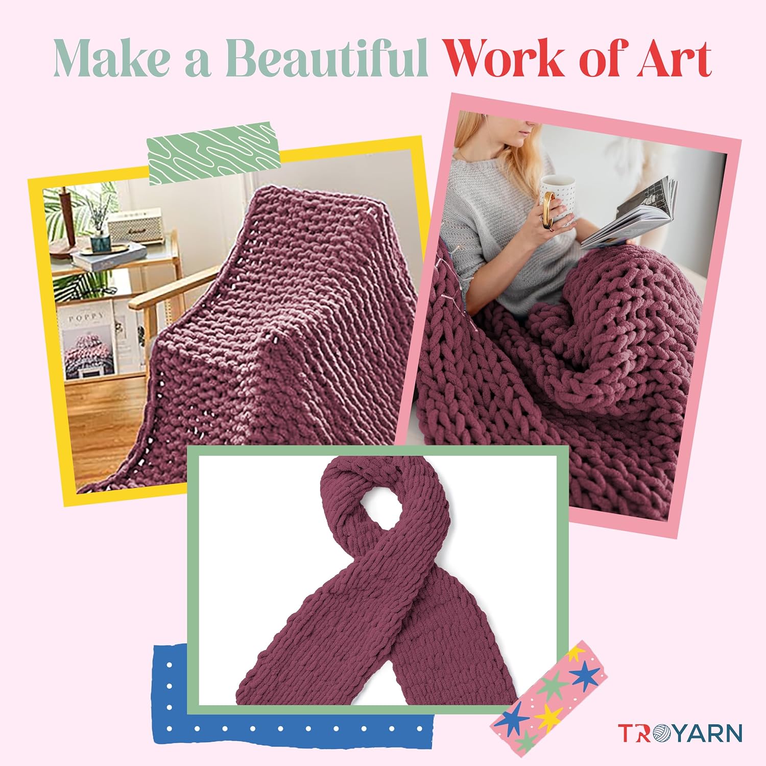 Jumbo Chunky Chenille Yarn – Each skein weighs 8 oz (226.8 g) and measures 28 yds (26 m) in length, with a diameter of approximately ¾ inch. Works best with US 50 (25mm) needles for smooth and effortless knitting or crocheting.Ultra-Soft & Lightweight – Enjoy the cozy, plush feel of chunky Merino wool without the heaviness! This super bulky chenille yarn is soft, fluffy, and easy to handle, making it perfect for all crafting projects.Versatile for DIY Projects – Ideal for hand-knit blankets, cushions, rugs, scarves, hats, macramé, weaving, and other home décor crafts. Whether you're a beginner or a seasoned crafter, this thick yarn offers endless creative possibilities.Fun & Easy for All Ages – Perfect for kids, teens, adults, and seniors to enhance their crafting skills. Use it for arm knitting, big stitch projects, oversized hand-knitted items, and more.Easy Care & Maintenance – Machine washable and dryable for hassle-free upkeep. Wash in cold water (max 30°C/86°F) on a gentle cycle, tumble dry on low, or air dry flat. Do not bleach, iron, or dry clean.