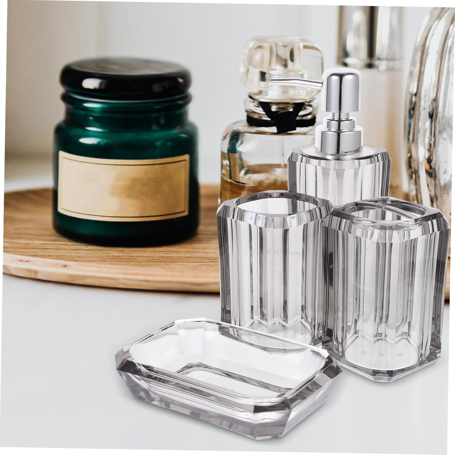 Package Include 1 x lotion bottle 1 x toothbrush holder 1 x mouthwash cup 1 x soap dish Features -Color:As shown Bathroom Lotion Dispensers -Size:10.30X6.50X6.50cm/4.05X2.55X2.55in(toothbrush holder) Shampoo And Conditioner Dispenser -Size:18.50X6.20X6.20cm/7.27X2.44X2.44in(lotion bottle) Soap Dish -Size:12.50X8.50X3.00cm/4.91X3.34X1.18in(soap dish) Shampoo Dispenser Bottles -Size:10.00X6.50X6.50cm/3.93X2.55X2.55in(mouthwash cup) Reusable Shampoo Bottle -Material:Acrylic, stainless steel bathroom accessories set -Made of reliable and stable materials, sturdy and , which can be used for a long time Kitchen Soap Dispenser. -Outfit your new bathroom or upgrade your current bathroom accessories set with its design, giving your bathroom a touch of elegant style Soap Dispenser Bottle. -Elegant appearance, fine workmanship, makes it a preferred your friends Soap Dispenser. -Reliable soap dispenser bathroom kit to last without breaking, leaking, or causing a mess Refillable Shampoo Bottles. -Lotion dispenser is according to ergonomic design, comfortable and easy to hold, toothbrush holder with stable structure Storage Container.Goods InformationLotion Soap Dispenser Fine workmanship and , can ensure the popularity.Kitchen Soap Dispenser Simple structure and smooth surface.Soap Dispenser This is a bathroom personal washing accessories, which is made of stable material for use, not easy to deform or break