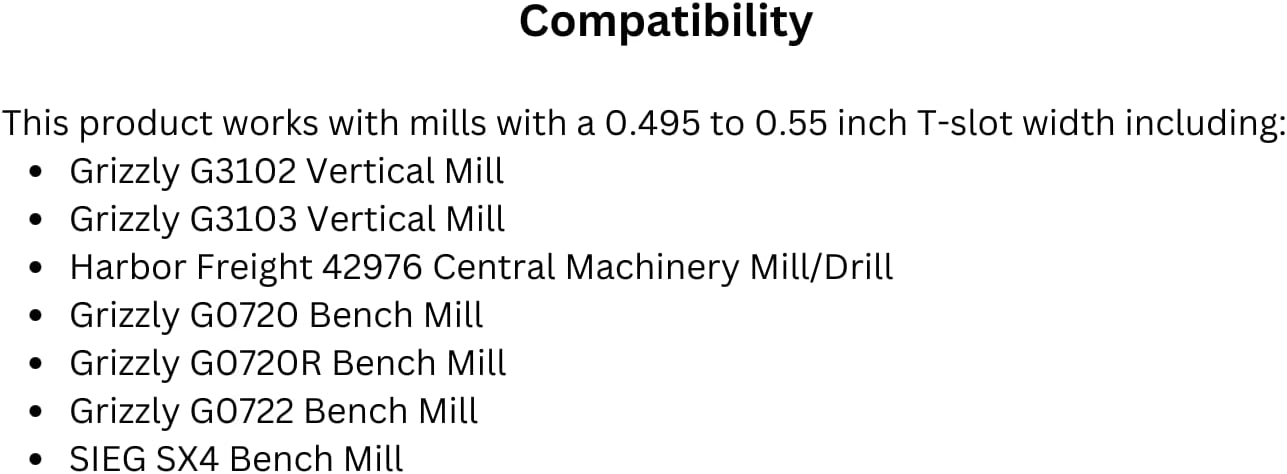 58-piece clamping kit.This clamping kit fits the 1/2" T-slots on many mill/drills.The clamping kit includes 24 3/8"-16 studs, 12 step blocks in pairs, 6 T-slot nuts, 6 flange nuts, 4 coupling nuts, and 6 step clamps.The stated dimension of the clamping kit is the width at the top of the T-slot.