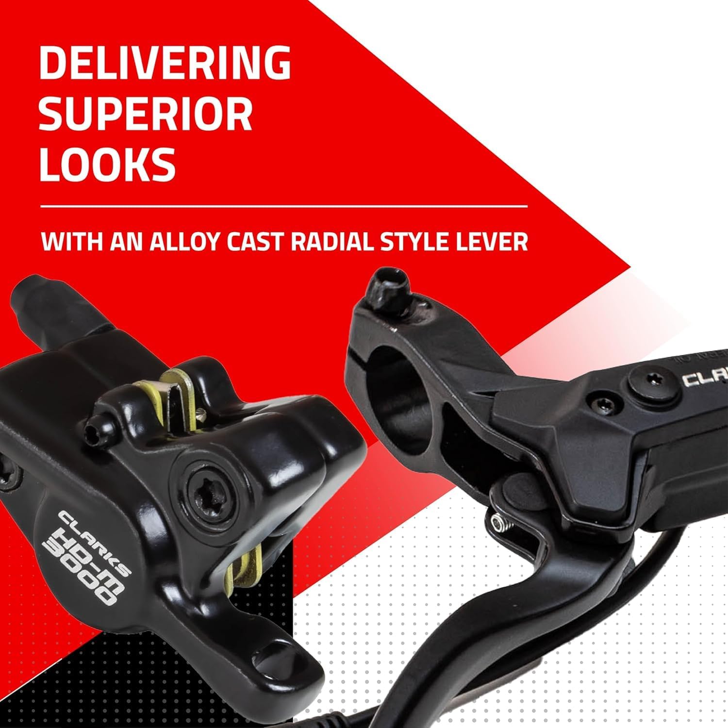 Clarks Cycle Systems HD-M3000e-Bike Hydraulic Disc Brake SetThe Clarks HD-M3000 hydraulic brake set is a reliable and efficient braking system. It features hydraulic disc brakes, which provide consistent and powerful stopping performance in both wet and dry conditions. The system is lightweight and includes adjustable levers for a customised fit, ensuring comfort and control for the rider. Additionally, it uses mineral oil, which is environmentally friendly and helps maintain the system's longevity.Dual Pistons - Open Hydraulic System E brake for Electric bikes, with sensor control design cutting line. Designed for use on 30km/hr E-bikes, it consists of a 2 piece forged calliper allowing internal maintenance, the brake is specifically designed for use with E-bikes and has an automatic motor shut off when the brake lever is applied resulting in safe braking. Sensor Control waterproof contact, 3/4 fingers lever length.Technical specificationsDesigned for use on 30km/hr E-bikesLightweight 2 piston hydraulic brake systemMotor shut off sensor to give greater controlFitted with motor cut off. Juliet Male 8 (2 pin) connector3/4 Finger leverLever reach adjustment to suit all hand sizesInternational standard and Post mount fitUses Mineral oil fluidMaterial: Stainless steel rotorsSpare olives to allow for hose reductionWeight: 280gComplies with and exceeds EN15194 and ISO4210 regulationsBox Contents:x2 Calipers, Hoses & Leversx2 Rotors and boltsx2 Brake Pads