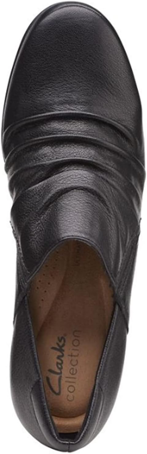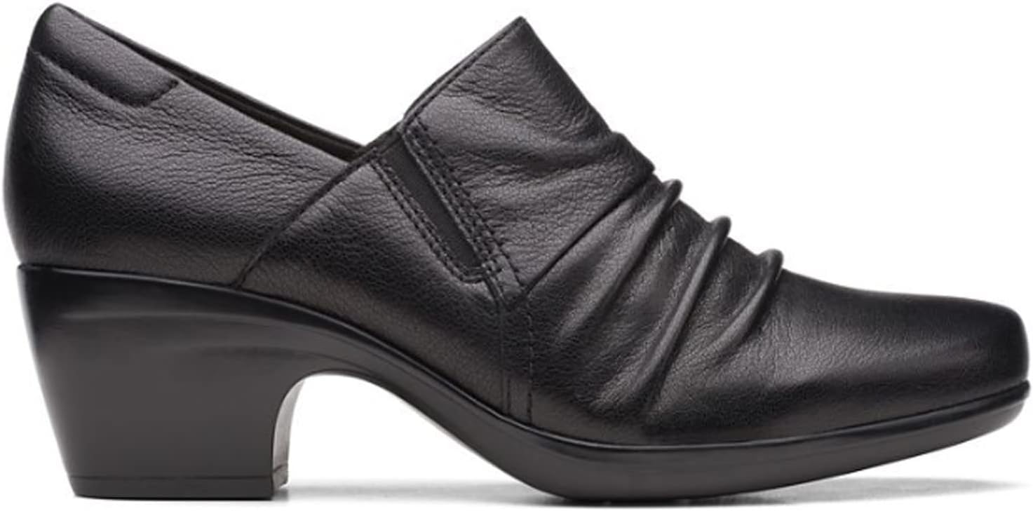 Everyday comfort meets smart elevation in the new addition to our Emily collection, Clarks Emily Cove. Underfoot cushioning combines with a sculpted heel and crafted, ruched black leather finish to create a stylish shoe ideal for workwear or dress-casual moments. - Black leather upper - Ultimate Comfort PU foam footbed - Grippy TPR sole - Heel height: 60mm