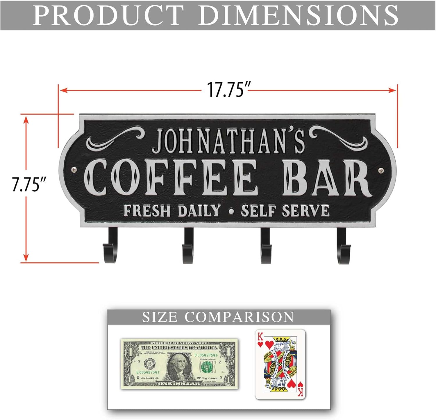 Bring a personalized touch to your kitchen or coffee nook with this handcrafted Coffee Bar Hook Plaque. Featuring the charming phrase “Coffee Bar. Fresh Daily Self Serve” permanently cast into the design, this plaque also offers a customizable line of text—perfect for your family name or a warm greeting (up to 12 characters). Made in the USA from recycled cast aluminum, the plaque is protected with Alumi-Shield, an all-weather coating that resists rust, fading, and weather damage. The plaque comes with four durable steel hooks to showcase your favorite mugs or teacups. Installation is simple—just two wall screws (included) spaced 16 inches apart ensure a secure mount into wall studs. With 10 beautiful color options and timeless craftsmanship, this wall-mounted plaque blends rustic charm with everyday function, making it a perfect addition to any home coffee station or a thoughtful gift for any caffeine enthusiast.