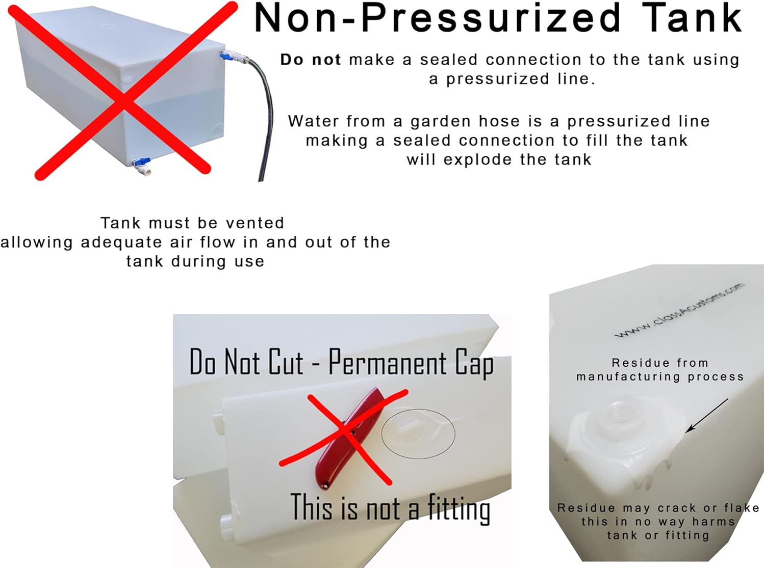 FRESH/DRINKING WATER SAFE – MADE IN THE USA by Class A Customs using NSF Certified Materials Tank & fittings made from DOW NSF International NSF/ANSI Std 61 approved Medium Density Polyethylene (MDPE) Resin SEAMLESS One-piece construction, no seams to burst COLOR Creamy White you can see waterline through tank. OEM PART No retail box - no install instructions Have a certified technician install all parts to prevent product damage and personal injury PREPARATION Tanks are made in a warehouse clean each tank prior to use to remove any debris, scuffs or marking from the manufacturing process. TANK MUST BE VENTED allowing air in and out when in use. *DO NOT PRESSURIZE TANK* do not make a sealed connection from garden hose directly to tank damage will occur. DO NOT over-tighten fittings damage will occur. MOUNTING & BRACING Place tank on level surface and brace to prevent tank from moving during transit. DO NOT hang tank by straps. DO NOT place weight on tank. FOOD VENDORS - BEFORE PURCHASING - Verify all requirements with health department where inspection will be made.