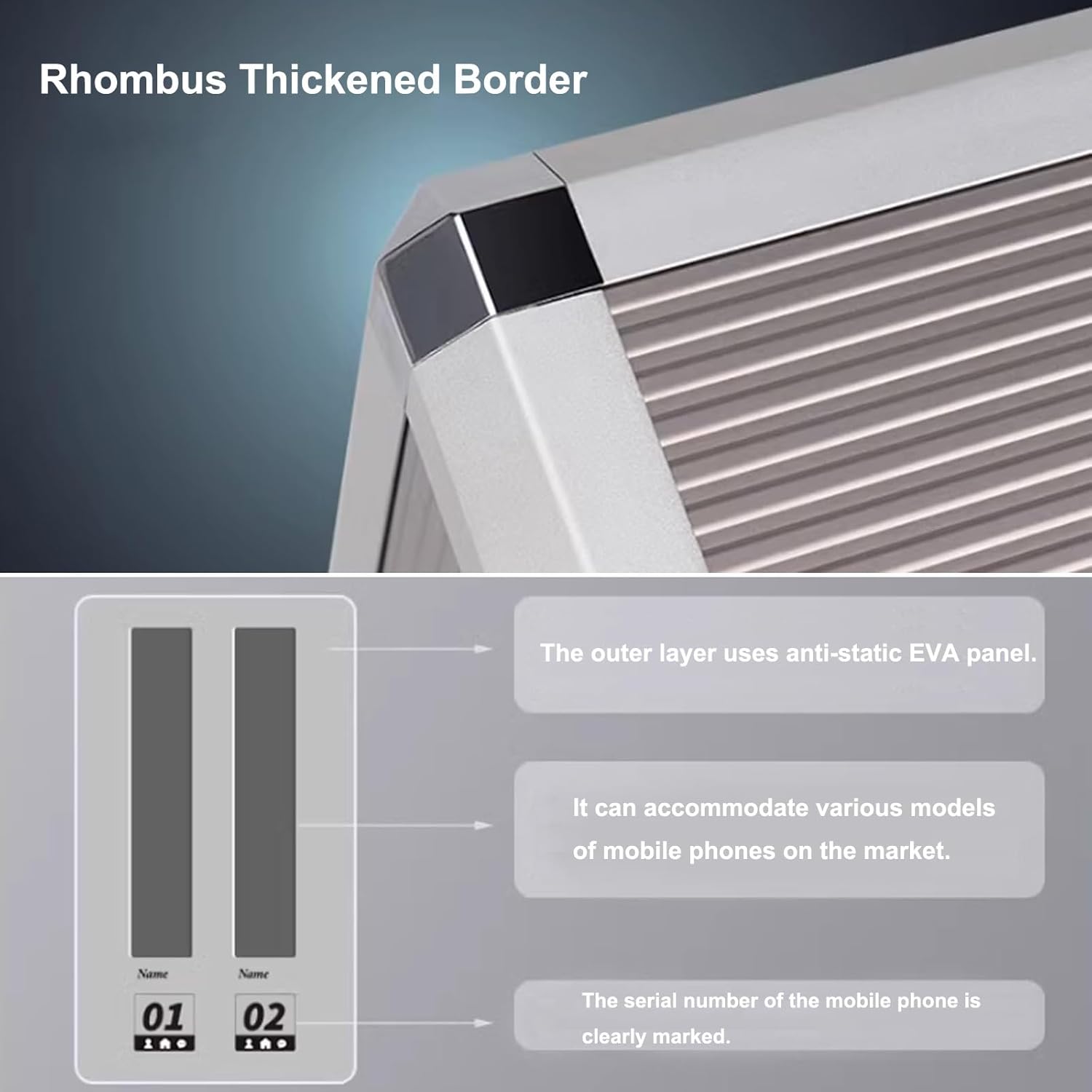 【Product Description】☂ Are you concerned about students' distractions caused by mobile phones during class? Our mobile phone locker is the perfect solution, accommodating up to 24 devices at once, making it highly practical for any educational environment. The spacious slots are designed to fit all smartphone models, ensuring no device is left behind.☂ Specifically crafted for classrooms and offices, this mobile phone lock box promotes a focused learning atmosphere by securely storing students' phones. Teachers can deliver lessons without interruptions, and after class, students will easily retrieve their devices. This mobile phone storage solution is an essential tool for enhancing classroom management.☂ Made from premium aluminum alloy and plexiglass, this mobile phone storage box features protective pearl cotton to minimize wear and tear on devices. Its innovative heat dissipation mesh helps regulate temperature, ensuring devices remain safe and functional.☂ With its modern design, this mobile phone locker is versatile enough for various settings, including offices, meeting rooms, and mobile phone repair shops. It's not just practical—it's stylish too, making it an attractive addition to any space.☂ We take great care in packaging your mobile phone locker. Each product is surrounded by cushioning materials to prevent damage during transit, ensuring it arrives in perfect condition.【Product Parameters】△ Product Name: Password Mobile Phone Safe△ Material: Aluminum Alloy△ Installation Type: Wall-mounted/Desktop△ Number of Slots: 24/36/48/60/72△ Dimensions: 28 cm x 21 cm x 40 cm (Length x Width x Height)△ Color: Silver【Packing List】Mobile Phone Storage Box *1
