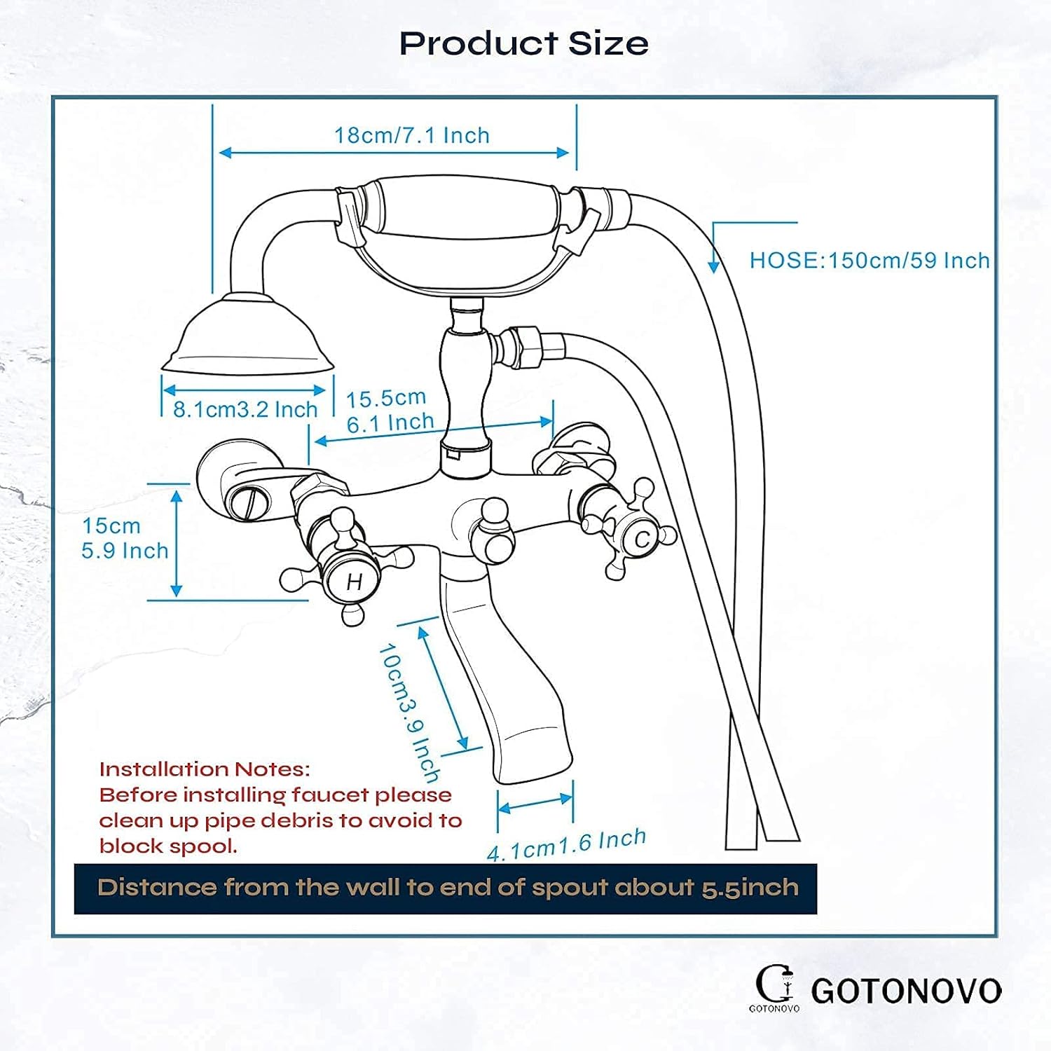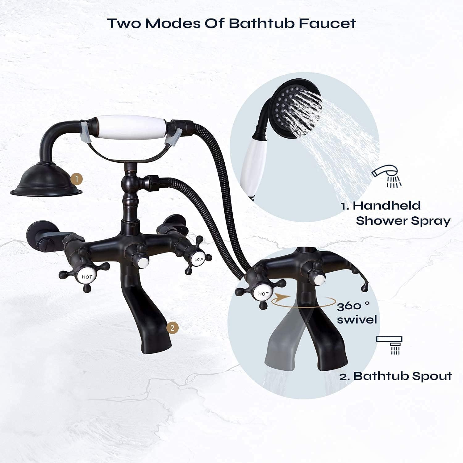 Product description This oil rubbed bronze bathtub faucet is made of premium brass material, easy to install with wall mount type, free adapter also can help to adjust installation hole between 3 inch to 9 inch. Double cross handle control hot and cold water.This chrome polished bathroom sink faucet is constructed of premium brass. Chrome polished finish can resist tarnish and corrosion from daily use. The double handle faucet is easy to install and two cross handles can easily control hot and cold water. Clawfoot Bathtub Faucet Details: Material:Brass Color:Oil Rubbed Bronze Installation:Wall Mount, 2 holes Spray hose:145cm(57") Weight: 2.45kg(5.39 pounds) Shower head diameter: 8cm(3.1") Spout reach:11 cm(4.3”)3 Hole Widespread Bathroom Faucet Details: Material: brass Color: Chrome Polished Finish: Chrome Polished Weight: 4.19 lbs Faucet Height: 6.5 inch Spout Height: 5.3 inch Number of handle: 2 Installation Type:Deck Mount Installation Hole: Three Holes
