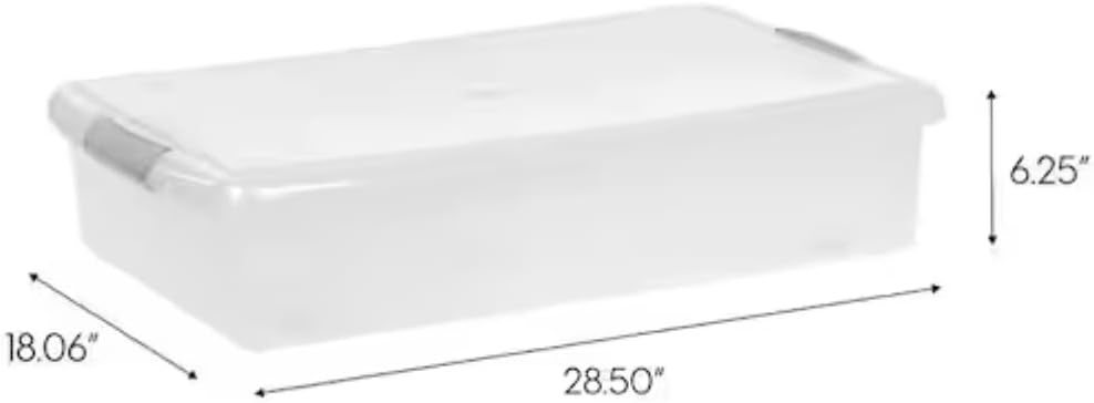 Maximize your storage space with the Clear 40-Qt. Underbed Storage Box. The low-friction disks on the bottom of the box make it effortless to move in and out of storage spaces without compromising any interior space. Stack multiple units in a closet or keep them neatly tucked under a bed. Secure your items with the durable latches that keep the lid securely attached. The clear lid and body allow for easy identification of the stored contents, while the neutral-colored buckles and low-friction disks complement any home decor. This storage box is designed to fit under most beds, offering a convenient and space-saving solution for organizing your belongings.