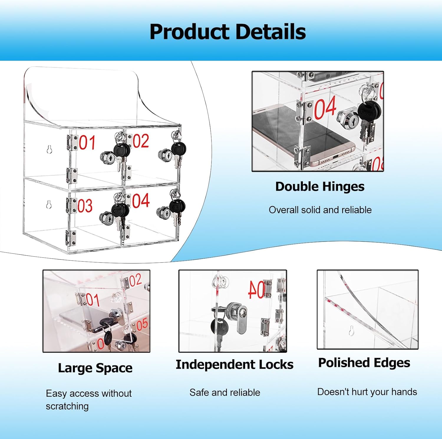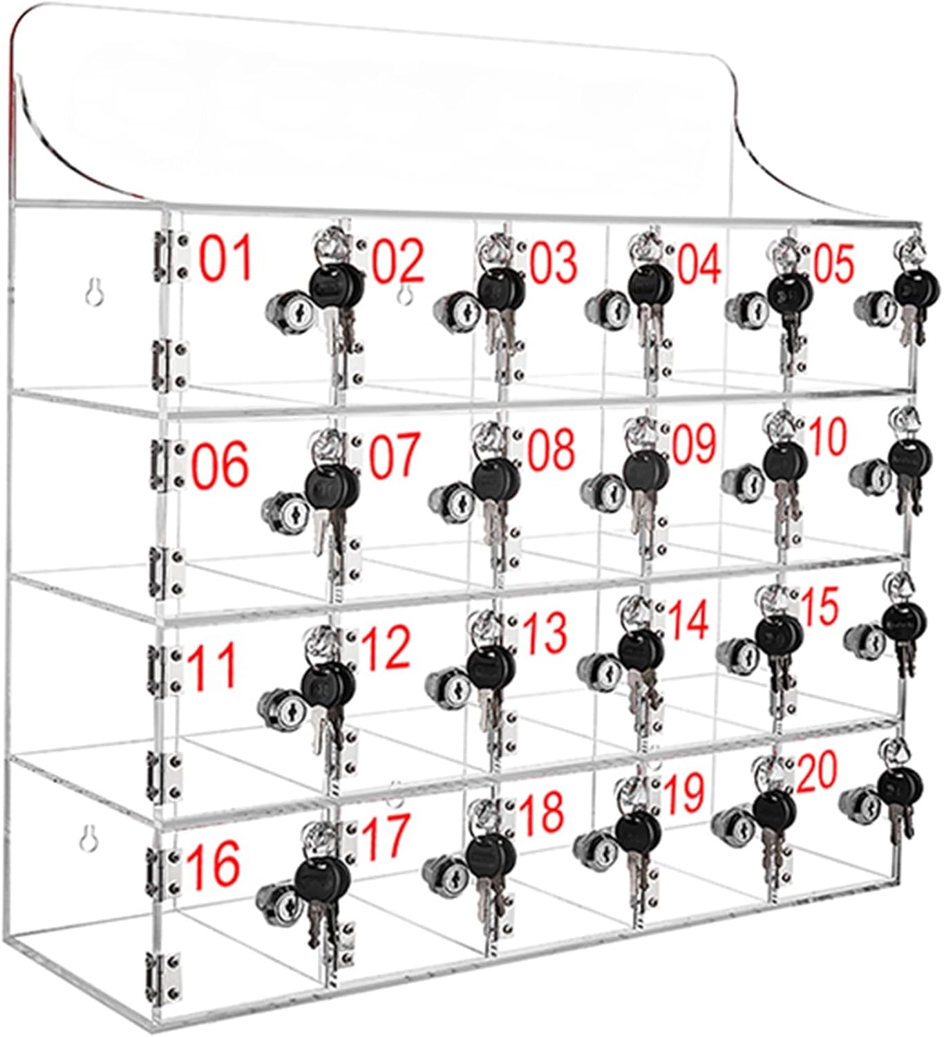 Introducing our innovative Cell Phone Cabinet, a perfect blend of security and organization for your mobile devices. Made from premium clear acrylic, this stylish cabinet not only protects your belongings but also enhances the aesthetics of any space—be it your home, office, or a public venue. This cabinet is equipped with multiple small doors, each featuring a secure lock and two keys, ensuring that your cell phones, wallets, and keys remain safely stored. With its robust construction and various size options, you can easily select the ideal cabinet to meet your specific storage needs. The transparent design promotes effortless visibility, allowing you to quickly locate your items. Whether you're aiming to declutter your living area, organize your workspace, or enhance security in communal settings, our Cell Phone Cabinet serves as the perfect solution. It is particularly useful in schools, workplaces, and events where managing phone usage is essential. Available in a range of dimensions, from compact to spacious, our cabinet's sleek rectangular shape and contemporary style make it a versatile addition to any environment. Each package includes 1 Cell Phone Cabinet along with bolts for straightforward installation. Please note that slight variations in size may occur due to manual measurements, and color differences may arise based on display settings. Elevate your organization efforts with our Cell Phone Cabinet—where convenience and security come together seamlessly.
