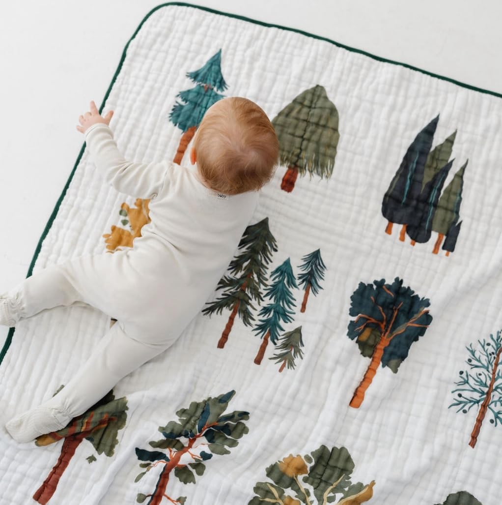 Snuggle up with our Forest Trees Quilt, a cozy and breathable muslin blanket designed with a charming grid of lush trees in earthy tones. The deep forest green reverse side adds a touch of nature-inspired beauty. Measuring 47x47 inches, this 100% cotton quilt is perfect for bedtime, playtime, or any time you need a soft and versatile layer. Its loose weave keeps your little one comfortable without overheating, while the absorbent fibers provide a gentle embrace. Embrace the great outdoors from the comfort of your home with this delightful muslin quilt.