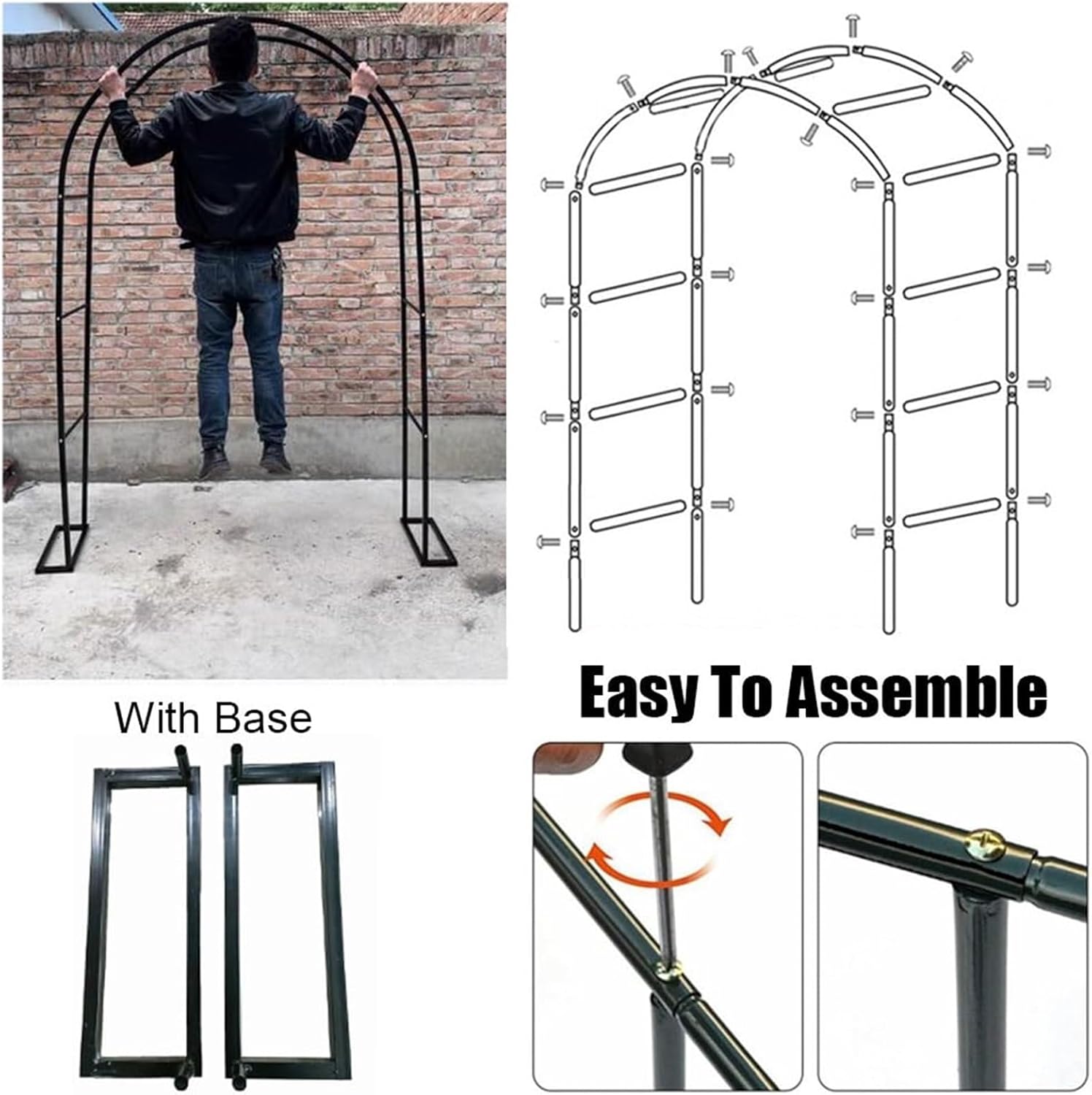 1. Ideal for events such as weddings, milestone anniversaries or sweet birthday parties or makes a great entryway to your garden, patio or driveway.2. Excellent Material: Constructed of steel tubes and coated with weather-resistant black epoxy. Magnificent display case for climbing vines or flowers.Specifications:Material: IronThe color blackPackage Included:1x metal garden gateEasy to install- Pre-cut and pre-drilled holes are aligned, screws can easily be screwed into the holes and assembled.
