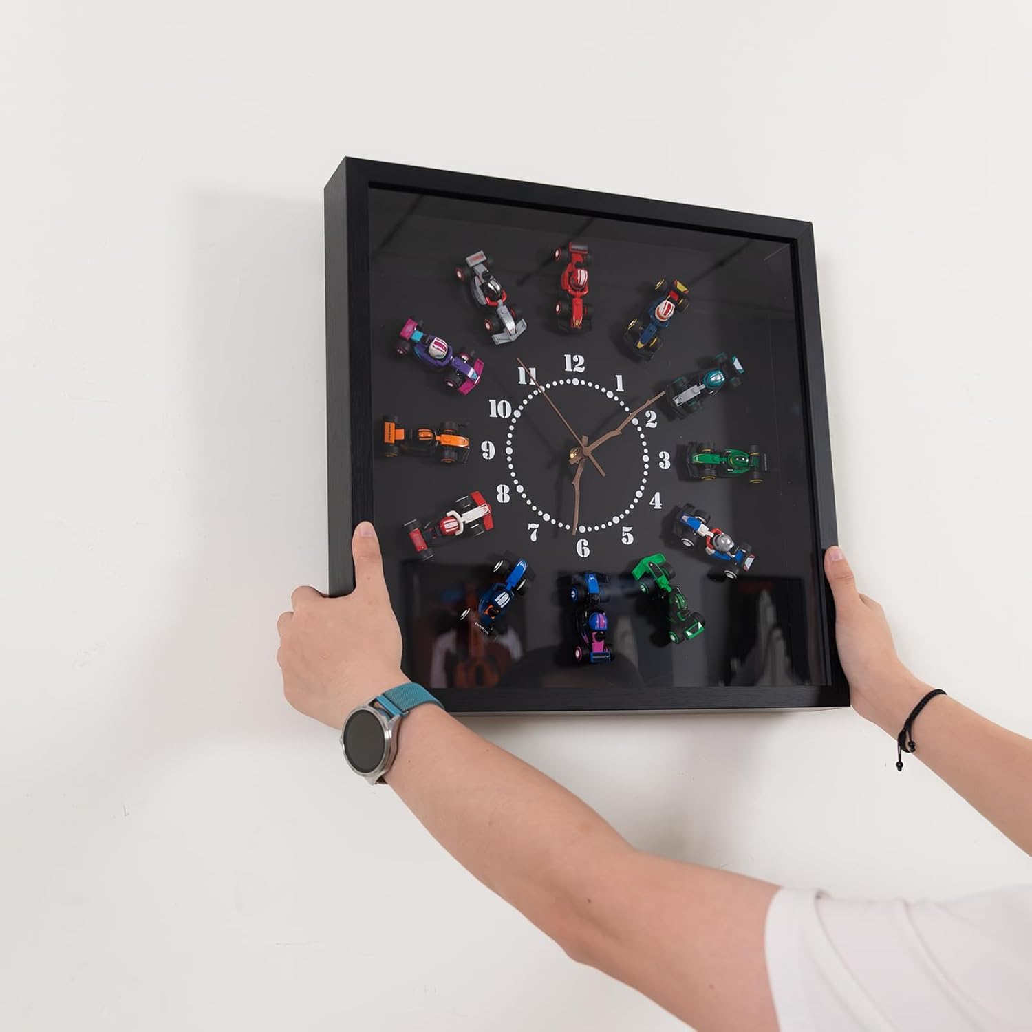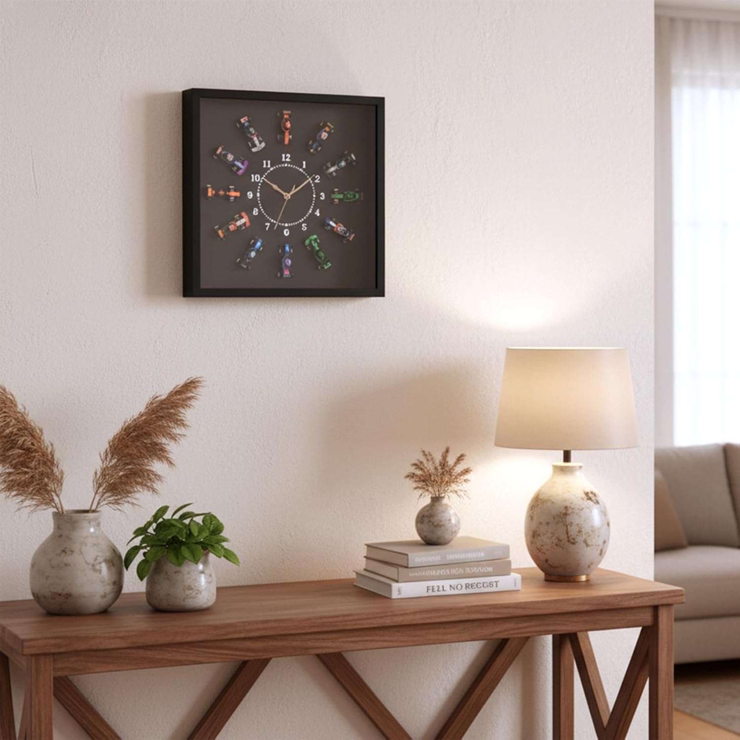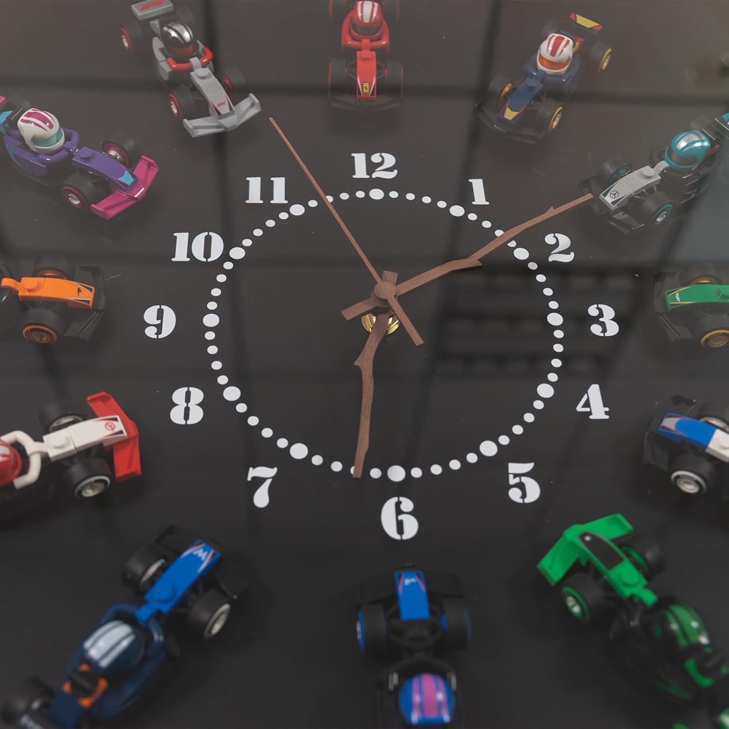 Clock-Themed Display Wallboard Compatible with Lego F1 Cars - Holds 12 Cars (1 per Hour Mark) Functional Wall Clock | Wall Mount for Adult Collectibles | Home/Office Décor (No Cars Included)