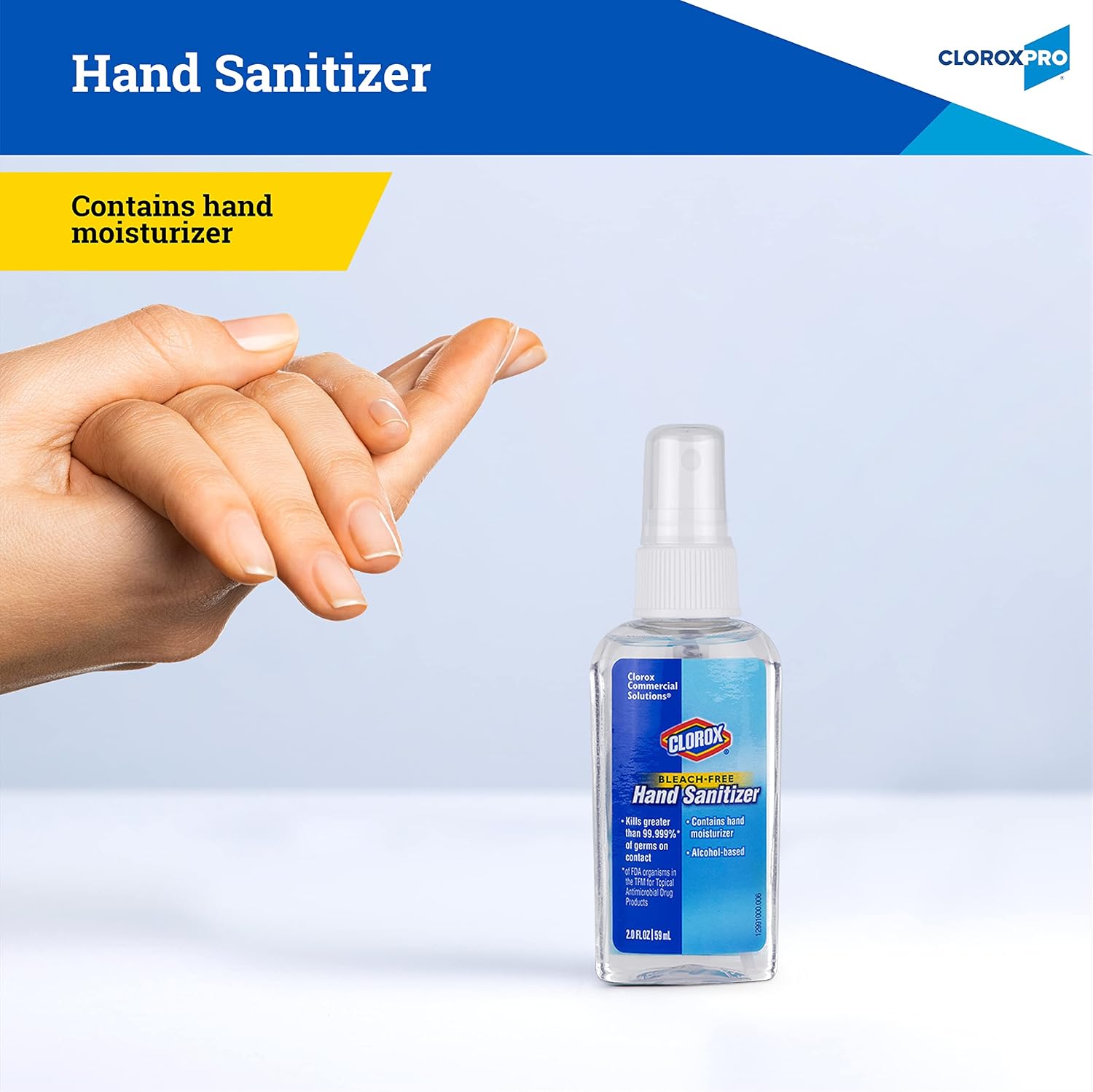 Clorox Pro Hand Sanitizer Spray is a professional sanitizer designed for everyday hand cleaning. This 2 Fl Oz mini hand sanitizer fits easily in your pocket or purse, making it ideal for on-the-go use. Formulated with alcohol content known to cleanse effectively, this spray hand sanitizer offers quick absorption without sticky residue. It’s perfect as both personal protection and refill solution. The compact size makes it great as travel size hand sanitizer or small hand sanitizer travel size option while still delivering the trusted Clorox quality you expect from Clorox hand sanitizer products. Use at workspaces where hygiene matters most—this bottle of hand sanitizer supports clean hands throughout busy days whether you're using bulk sanitizers or individual bottles like this one. Its easy-to-use design ensures even coverage compared to gel-based options such as foaming hand sanitizer refill types that may leave behind messes when used frequently during daily routines. This portable choice complements other large hand sanitizer solutions by offering flexibility between big bottle of hand sanitizer needs and convenient top travel items like mini sprays kept close at all times. Whether stored alongside automatic hand sanitizer dispenser units in offices or carried solo among kids’ backpacks next to scented hand sanitizers—it adapts effortlessly across settings requiring reliable cleanliness support fast! DRUG FACTS: Active Ingredient Ethyl Alcohol 71%. USES: Hand sanitizer to help reduce germs on the skin that could cause disease. DIRECTIONS: Spray clean, dry hands and nails. Wet hands thoroughly with product. Rub hands together for no less than 15 seconds, paying particular attention to interdigital spaces, fingernails and cuticles. Allow to dry without wiping. Rub hands together briskly until dry. Please see the complete product label for full usage instructions.