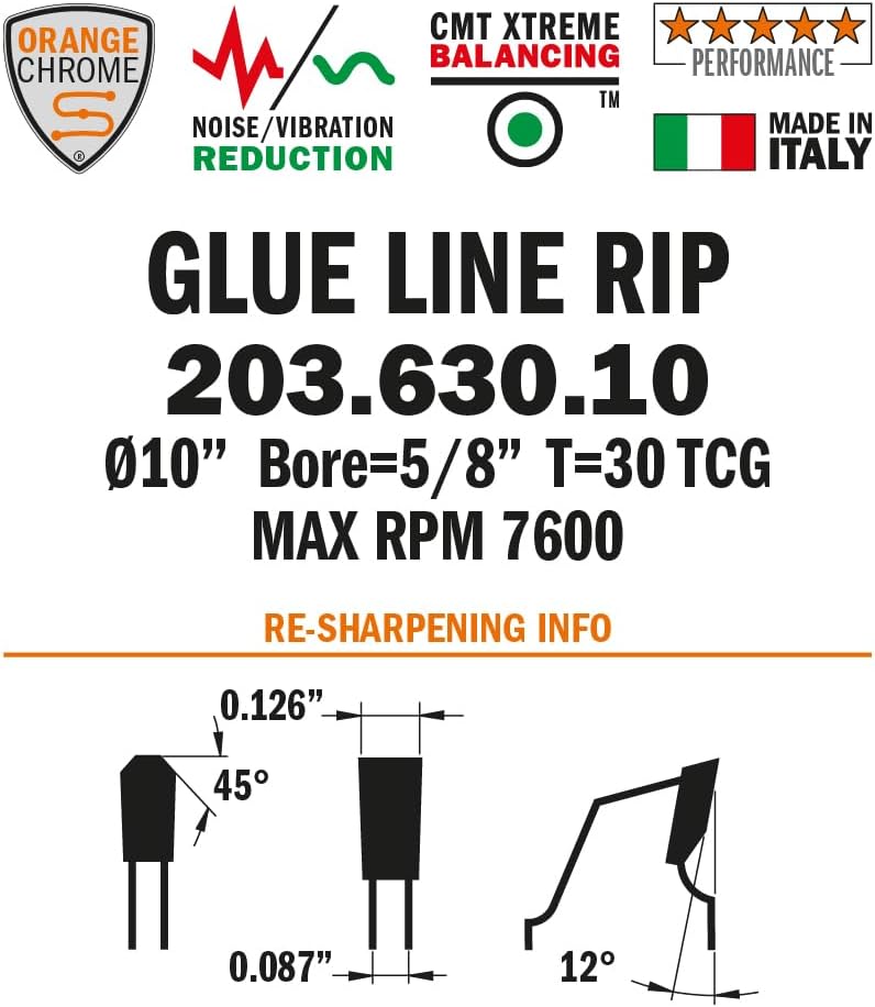 CMT's chrome heavy duty ripping gluing saw blade is for heavy-duty glue line rip cuts with an exceptional finish for cuts in softwoods, hardwoods, and plywoods and can be used on radial arm saws, miter saws, table and special saws. All prices are per single blade unless an item number has a dash(-) and then a number at the end which designates the number of included blades. CMT's Chrome Blades - designed for professional woodworkers who require high precision and durability from their saw blades. Special chrome carbide reduces tooth abrasion, whereas the chrome plated body protects against rust, corrosion and guarantees longlasting performance. Teeth are made from a specially formulated industrial chromium micrograin carbide which stays sharper longer by reducing cutting edge abrasion, improving cut quality and tool life. Size Legend (in inches unless otherwise noted): D = Diameter (inches and/or mm) T = Tooth Count B = Bore (inches or mm) K = Tooth Thickness (inches) P = Blade Thickness (inches) Technical Info: CMT products are manufactured for industrial applications and woodworking cutting tools are utilized by world leading furniture makers, kitchen manufacturers and CNC machinery manufacturers. Because of our intense investment in advanced production technology, CMT is able to offer industrial tooling at an affordable price to an ever growing following of cabinet makers, contractors and woodworkers as well our manufacturing customers.