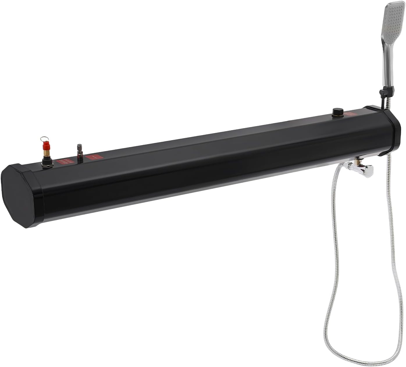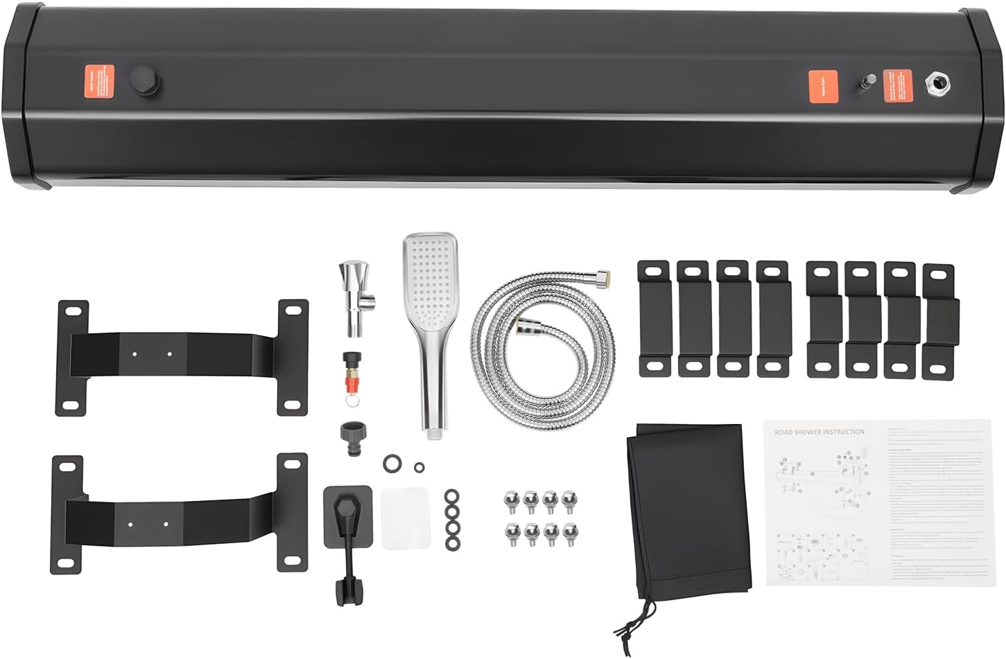 DetailsStorage Bag: You can put this product and other accessories inside to prevent loss and easier storage.Long Water Pipe: The 5.58-foot long water pipe allows for more flexible flushing.Large Cap Opening: It allows quickly water adding, saving your time.ApplicationThis product can be installed on the roof crossbar luggage rack, platform luggage rack, roof tent, roof luggage box, roof luggage frame of SUVs, sedans, RVs, trucks, etc. It is used for washing activities such as surfing, beach travel, camping, off-road, fishing, tuple, hunting, and construction projects.Specification Material: PVC, Copper, ABSProcess: Chromium PlatingColor: Black+SilverMount Type: Roof-mountedAssembly Requirement: YesWater Hose Length: 1.7m/5.58ftApplicable Crossbar Spacing: 56-90mm/2.2-3.54inSafety Valve Standard Pressure: 1.6barMax. Temperature: 60โ/140โWater Tank Capacity: 30L/7.93galProduct Size: 22*18*114.5cm/8.6*7*45inPackage Size: 119*31*22cm/46.85*12.2*8.66inGross Weight: 7.8kg/17.2lbsNet Weight: 6kg/13.23lbsPackage Included1 * Water Tank1 * Water Hose1 * Shower Head1 * Storage Bag1 * English InstructionOther Accessories for InstallationNotes1.Please read the operating manual completely before use. And pay particular attention to the safety instructions included. 2.Before adding water to the water tank, please lift and pull the safety valve lever to release all pressure in the tank.Please allow the slight color difference caused by the shooting light and 1-3cm error due to manual measurement