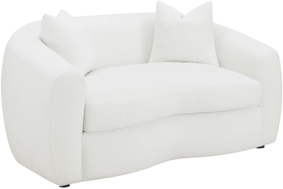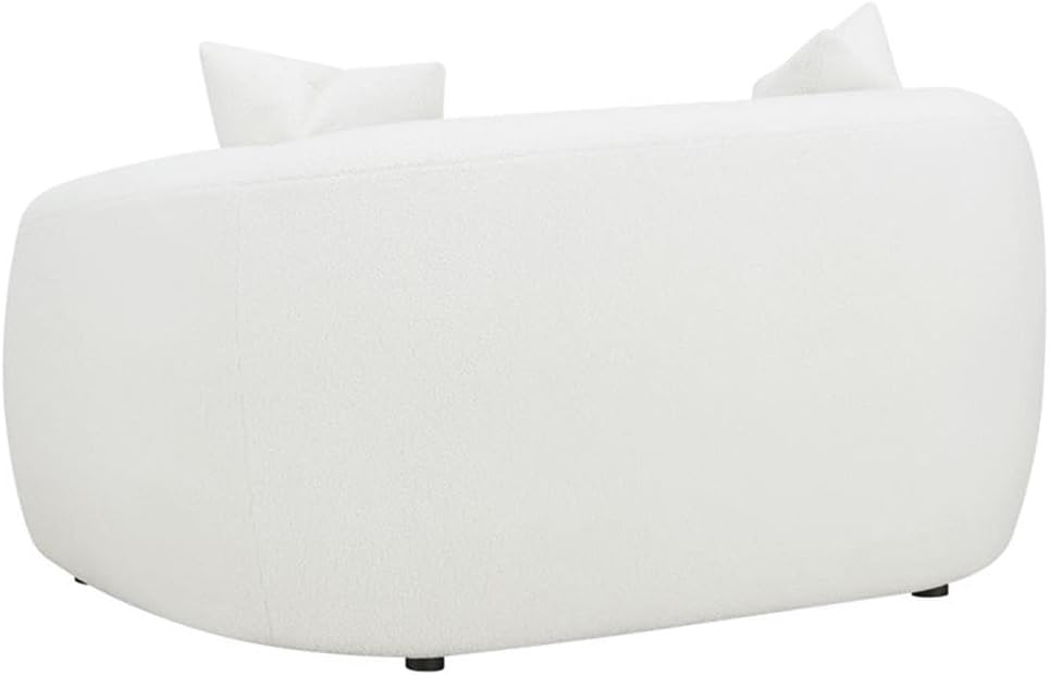 Create your modern entertaining area with this contemporary natural seating set, designed with a boucle fabric across its cloud-like contoured frames, sloped armrests and curved bench seats. Coordinating boucle accent pillows with premium faux down fill offer the finishing touch and extra comfort as contrast bold black legs hidden below elevate each seat ever so slightly.