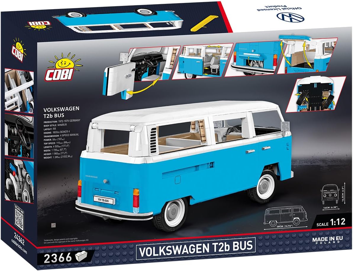 Build a model of the Volkswagen T2b Bus in an amazing 1:12 scale - your retro adventure begins here!Create your own version of the classic Volkswagen Bus - this huge model will take you to the times when travel meant freedom, adventure and independence. And all this enclosed in 2366 precisely made blocks!Volkswagen T2b - a classic on wheelsThe Volkswagen T2b, also known as the "Bay Window" due to its panoramic windscreen, debuted in 1967 as the successor to the legendary T1 "cucumber". It was the second generation of the iconic Volkswagen Transporter - a car that changed the way we travel forever.The T2b had a more modern silhouette, a more spacious interior and better driving characteristics. It quickly won the hearts of drivers around the world - from family holidays, through hippie adventures, to commercial use as a delivery van or ambulance.Production ended in Germany in 1979, but it continued in Brazil until 2013! Today, the T2b is not just a car - it is an icon of motoring, lifestyle and the spirit of independence.Now you can recreate this legendary vehicle in the form of a model from COBI blocks and feel the atmosphere of the golden age of travel - make a piece of history appear on your shelf!Why is it worth choosing the Volkswagen T2b Bus set from COBI?Impressive number of elements - The model in a large collector's scale of 1:12 consists of as many as 2,366 elements, which translates into a length of over 30 cm and a wealth of detail. This is a real treat for fans of classics!Realistic design – Characteristic, rounded body lines, detailed front, proportions and finish – each element has been carefully designed with maximum similarity to the original in mind.Original Volkswagen license – The official manufacturer's license is a guarantee of authenticity – from shapes, through colors, to the smallest details.Durable prints – no stickers! – All graphics and markings are printed on the blocks and are resistant to abrasion, which ensures durability and aesthetics for many years.Interior refined in every detail – Dashboard, seats with folding backrests, printed curtains and many other elements create a complete, atmospheric space.Opening doors and flaps, steerable wheels – The front doors can be opened, the side doors are moved – just like in the original. The rear flap allows you to look into the engine compartment. The steerable wheels respond to steering wheel movements – the model not only looks, but also works!Intuitive step-by-step instructions – Clear instructions based on illustrations guide you through the entire assembly process in an accessible and enjoyable way – regardless of age and level of experience.Expand your collection – T2b Bus is part of the COBI CARS series, which includes the most iconic vehicles in the history of motoring. Collect them all!>Volkswagen T2b Bus – more than a modelIt's more than just blocks. It's a tribute to a lifestyle that focuses on freedom, independence and a journey into the unknown. Iconic design, precise workmanship and lots of details make this set an ideal proposition for:Lovers of classic motoringFans of construction challengesCollectors of unique modelsAnyone who wants to feel the spirit of the 70sBuild your own automotive icon and set off on a retro journey – with the Volkswagen T2b from COBI!