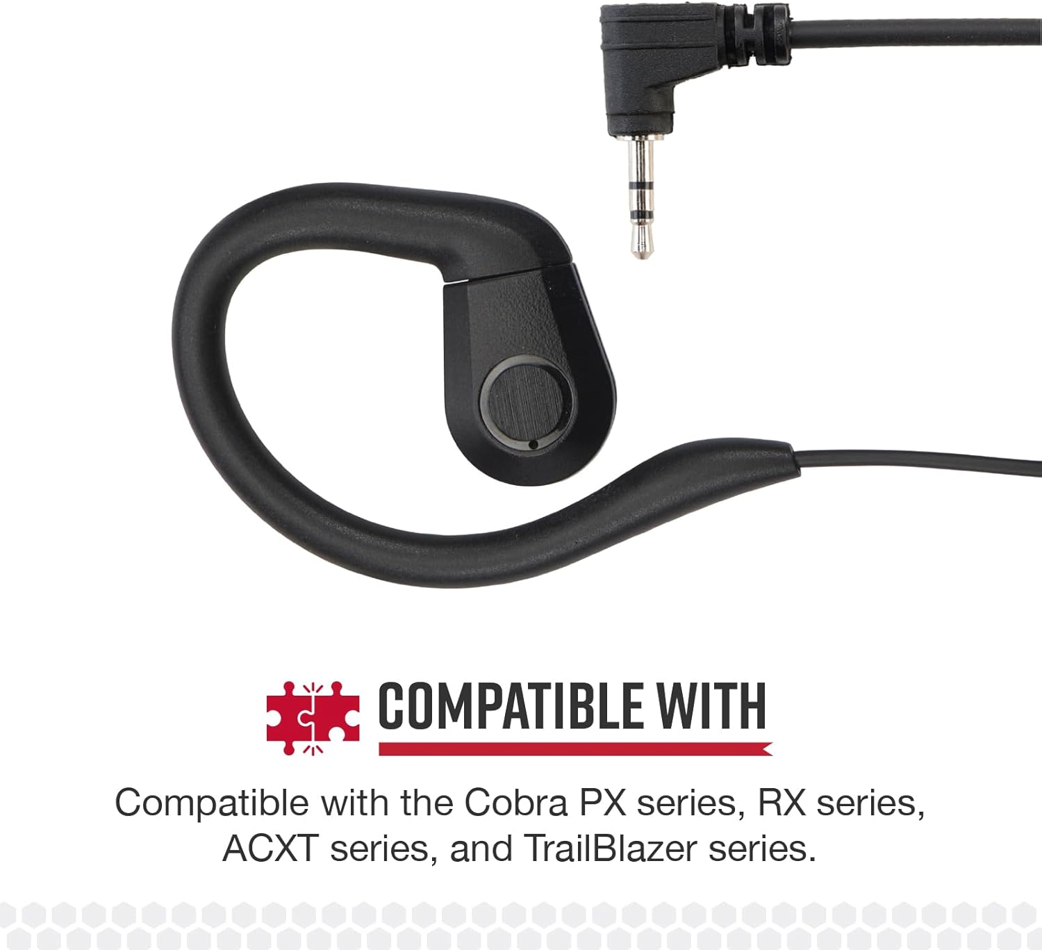 For two-way radio users who demand low-profile, hands-free communication capability, the Cobra 2.5mm C-Style In-Ear Headset delivers discreet performance without sacrificing audio quality or comfort. This compact in-ear design fits comfortably inside your ear canal for barely visible communication. The flexible C-shaped hook curves around your ear to keep the earpiece securely positioned throughout your shift, preventing it from falling out during movement while remaining comfortable enough for all-day wear without irritation. The convenient push-to-talk button and VOX switch with clothing clip allows quick, discreet communication while keeping both hands