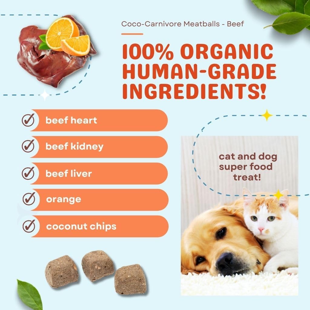 The ultimate freeze-dried, RAW meat treat, Coco-Carnivore Meatballs is for the meat lover connoisseur. We wanted to make freeze-dried meat treats that were not only delicious, but super healthy for our pets. This meant that we only use meats that are antibiotic-free, hormone-free, and Non-GMO. We also wanted to make sure the meats were humanely raised and ethically produced, sourced from USA farmers and producers. Then we added the extra health benefits of super-foods from fruits, vegetables, herbs, plus our CocoTherapy Coconut Chips!
