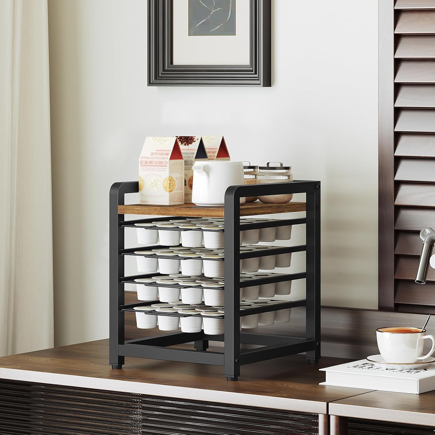 "YATINEY Coffee Pod Drawer Holder, Enjoying Leisure Time in Your Own Style A fast-paced job always lets you feel lost, and a cup of coffee can easily restore your energy. Then the coffee bag storage rack has its meaning. YATINEY coffee capsule storage organizer with compact body can satisfy your various placement preferences. Its mesh drawer facilitates the storage of coffee pods or capsules and its rustic appearance expresses the nobleness and functionality. Just indulge yourself in more surprises made by YATINEY! Specifications: - Color: Rustic Brown, Black - Material: Particleboard, Iron - Dimensions: 11.8""W x 15.7""D x 3.5""H - Weight: 5.3 lb Package Contents: - 1 x Coffee Pod Drawer Holder - 1 x Accessory Package - 1 x Assembly Manual YATINEY Coffee Pod Holder - Its 4-layer metal shelves neatly hold your favorite coffee capsules, while the top shelf accommodates your coffee machine, sugar cubes, mugs, and other coffee accessories. No more searching through cabinets. Enjoy a one-stop coffee brewing experience to start your day in the best way possible."