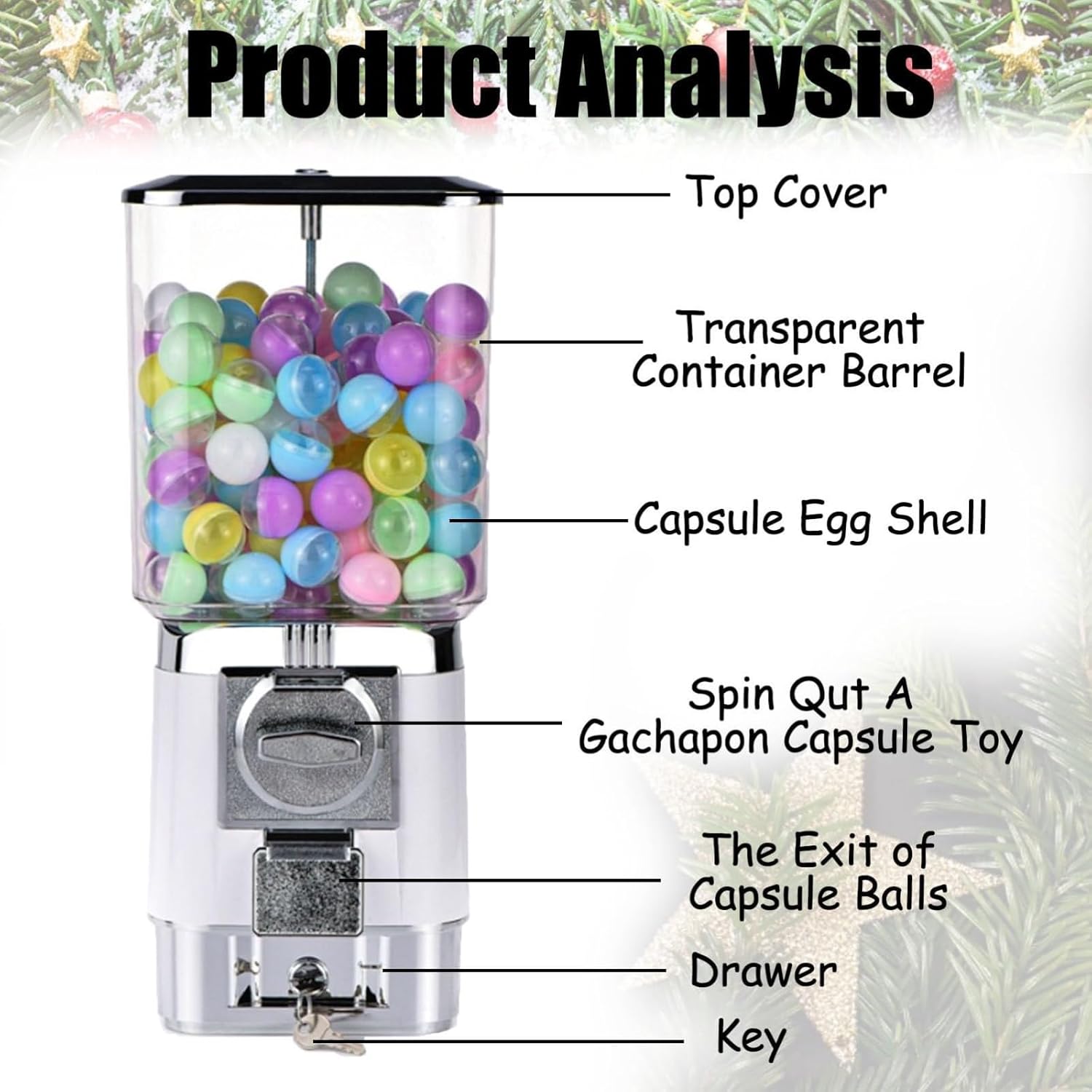 **Product Description** Elevate your retail or home space with our innovative capsule vending machine, designed to blend eye-catching aesthetics with practical functionality. This versatile unit not only attracts attention in stores but also enhances customer interaction through unique prize draws, surprise gifts, or engaging toy dispensers. Ideal for coffee enthusiasts, it doubles as a stylish storage solution for coffee capsules, making it a delightful addition to any kitchen. Furthermore, it serves as a miniature reward machine for children, turning everyday moments into exciting experiences. **Product Features:** 1. **Versatile Dispensing:** Accommodates various capsule sizes (10–32 mm) and treats, perfect for candy or toys. 2. **Instant Surprise:** Lift the lid to reveal a delightful treat, creating anticipation and joy. 3. **Appealing Design:** Captivates all ages with its modern look, making it a great fit for any environment. **Product Specifications:** - **Product Name:** Capsule Vending Machine - **Capacity:** Holds up to 200 capsules - **Available Colors:** Gold, Silver, White, Black, Red, Yellow, Blue, Green, Purple, Pink, Copper, Light Green, Sky Blue, Light Yellow, Light Purple - **Weight:** 2 kg - **Dimensions:** 20×20×42 cm (7.9×7.9×16.5 in) **Product Contents:** - 1 × Twist-Action Capsule Vending Machine - 200 × Empty Capsule Shells (random color mix) - 100 × Stainless Steel Tokens **Important Notes:** Please review the instruction manual before use for optimal performance. Dimensions may vary by 1-3 cm; ensure accurate measurements before installation. Color discrepancies may occur due to monitor variations, and we appreciate your understanding. **After-Sales Service:** For any inquiries before your purchase, please reach out to us via email for prompt assistance. We hope you enjoy your shopping experience!