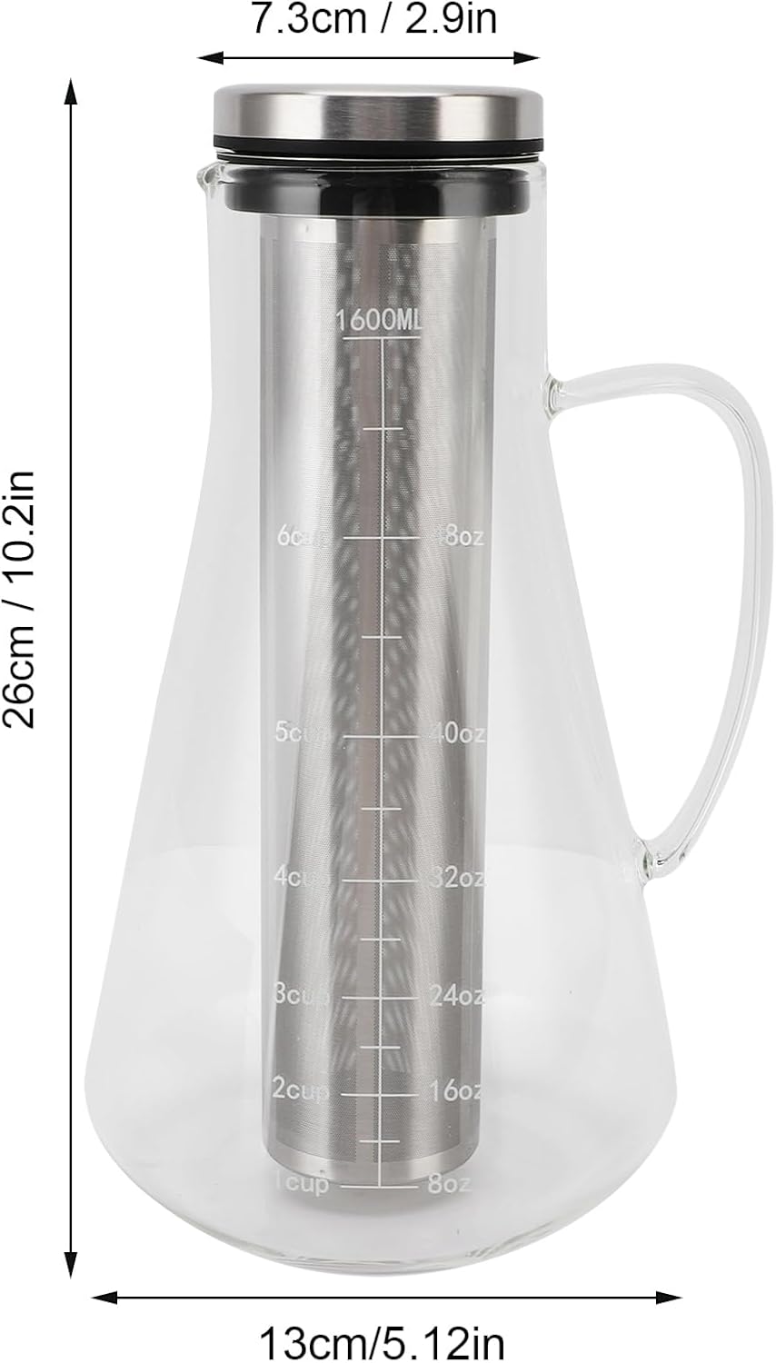 Specification: Item Type: Cold Brew Coffee Maker Size: Approx. Diameter: 7.3cm / 2.9in, Height: 26cm / 10.2in, Bottom Diameter: 13cm / 5.1in Capacity: 1600ML Material: High Borosilicate Glass, 304 Stainless Steel Temperature Range: -20℃ to 130℃ Application: Suitable for Home Daily Use, Office, Tea House Weight: Approx. 923.00g / 32.56oz How to Use: After , you can use it PackageList: 1 x Cold Brew Coffee Maker 1 x Filter 1 x Lid
