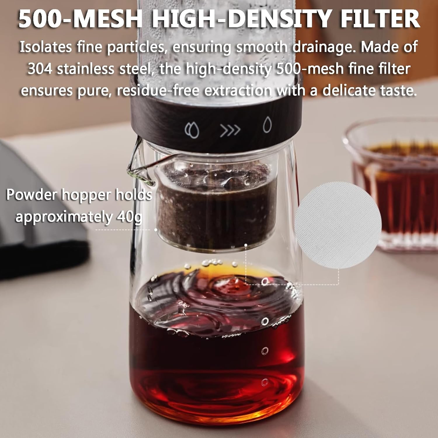 The Ice Drip Pot features a 40g powder compartment and a dual 450ml upper and lower pot design. Crafted with a combination of materials including a high borosilicate glass lower pot and 304 filter, it ensures durability and optimal flavor extraction. The lid, inner adjustment ring, filter cover, adjustment ring, and valve cap are made from PCPCTG for reliable performance. Weighing approximately 471g, this pot is designed for easy use and efficient brewing. Package includes one Ice Drip Pot.