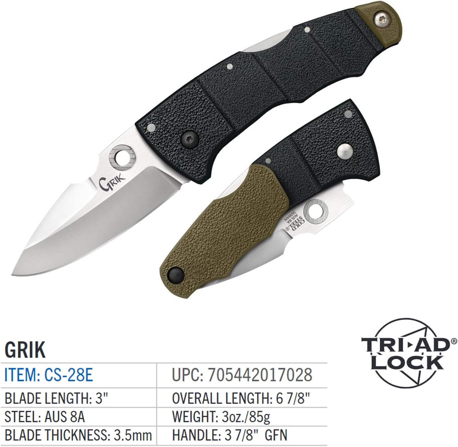 COLD STEEL GRIK VERSATILE POCKET FOLDING KNIFE The Cold Steel Grik is a pocket-friendly, functional utility and everyday carry knife. The Grik's distinctive modified spear point blade is made from expertly heat-treated and cryo-quenched Japanese AUS8A steel for a perfect balance between edge holding and ease of re-sharpening. A shallow indent in the spine of the blade makes a comfortable thumb stop for leverage when doing hard work, or a rest for your index finger when using the tip for precision cutting. Made from ergonomically contoured GFN with a replaceable and reversible clip, Grik's handle is an extremely thin and flat low-profile carry. The Grik's polymer clip is incredibly comfortable in hand, negating those hot spots that often occur when using a steel-clipped folder for any prolonged length of time. Plus, unlike a steel clip it won't scratch your paintwork or tear the leather seats in your car! Equipped with our Tri-Ad locking mechanism, which has been proven to offer unsurpassed levels of safety security, and strength, the Grik is a tough, practical, and functional everyday working tool that you will quickly find to be utterly indispensable.