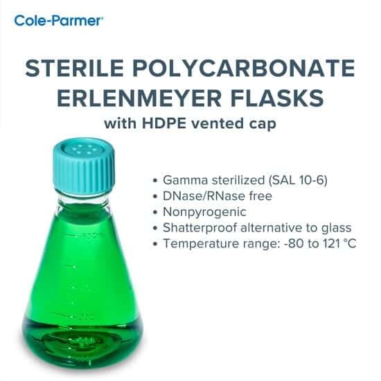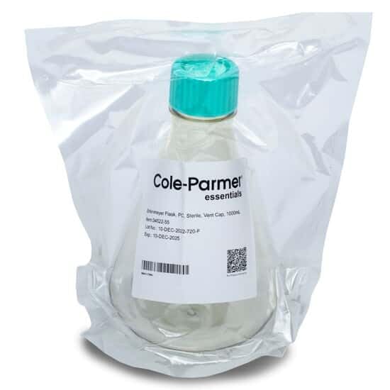Ideal for media preparation, mixing cell cultures, and storage, these sterile polycarbonate (PC) Erlenmeyer flasks are a safe and shatterproof alternative to glass. The clear flasks feature molded-in graduations allowing you quick volume assessment. Liquid sticking-resistant design at the neck repels liquid for easier pouring. These Erlenmeyer flasks have a temperature range of -80 to 121 °C (-112 to 249.8 °F), and the flask body can be autoclaved a single time. Optional baffled bottom models that help improve mixing are available. HDPE caps are included. Choose from a leakproof plug seal cap or a vented cap with 0.22 µm hydrophobic PTFE membrane for continuous gas exchange. Manufactured in an ISO Class 8 (formerly Class 100,000) cleanroom environment, these Individually packaged Erlenmeyer flasks are sterilized by gamma irradiation per ISO 11137-2 (SAL 10-6), and are ISO 13485 and ISO 9001 certified, DNase/RNase free, and nonpyrogenic. SpecificationsSurface Treatment: Unbaffled bottom Flask Type: 50 Filter Size: 1000 Sidearm: 39 Joint Size Number: 250 Neck Type: 1000 Graduation Interval (mL): 32 Max Graduation (mL): 21 Inside Rim Diameter (mm): 8.26771653543307 Min Graduation (mL): 39 Capacity (mL): 12.6 Capacity (oz): yes Overall Height (cm): High-density Polyethylene (HDPE) Overall Height (in): Vent Top Outside Diameter (mm): Polycarbonate (PC) Base Diameter (cm): Sterile Erlenmeyer Flasks, Polycarbonate, Vent Cap, 1000m L (32 oz) 6/Cs Autoclavable: 3 years Cap Material Cap Type Material Tolerancem L Universal Description Universal Guarantee