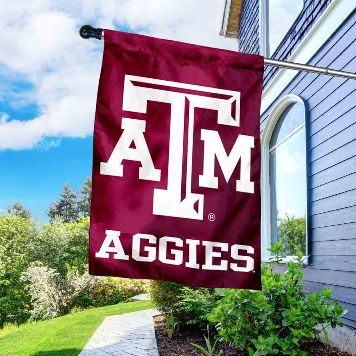 Texas A&M Aggies Outdoor Flag with Flag Pole Set is an ideal flagpole set for your front entry to display your Team Spirit. This bundle includes your selected 30" x 40" Double Sided House Banner Flag along with a Sturdy 5 Foot Stainless Steel Flag Pole. The double sided banner flag measures roughly 28x40 inches, is made of 2-Ply Polyester with sewn-in liner, is Double Sided Screen Printed, has a top pole sleeve for inserting the included spinning clip flagpole. The 5 foot chrome flagpole measures an assembled length of 60 inches and includes two (2) black spinning clips and one (1) black PVC plastic ball top. Also, the 1 inch diameter pole is made of thicker 0.48mm stainless steel, is powder coated chrome, and is made of 4 threaded screw together sections for easy setup. The Flag is Officially Licensed and College and University Approved.