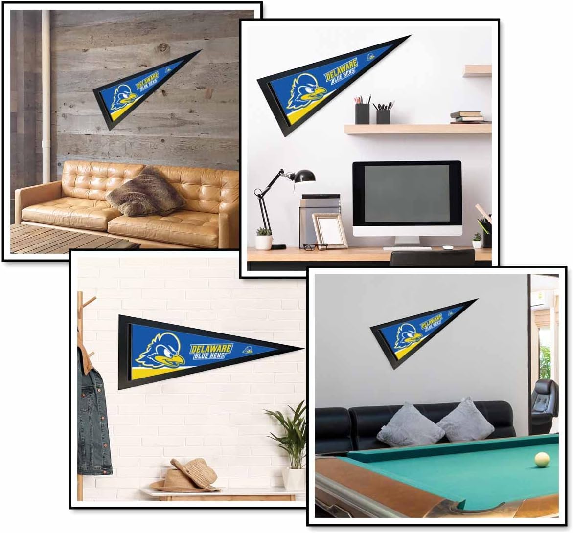 University of Delaware Felt Pennant and Wood Pennant Frame includes a 12x30 inch soft poly felt Officially Licensed pennant and the recommended Pennant Frame which is made of solid poplar wood.The pennant is full size, single sided screen printed, and is ideal to display on any wall of your home, office, gameroom, or as a banner. The Pennant Frame is 13.25 x 34.25 inches, made of poplar wood moulding, stained black satin, includes a plexiglass front, and fits this pennant perfectly. Please Note: The pennant frame has a protective plastic film on both sides of the plexiglass. Please peel off from both sides when ready to use.