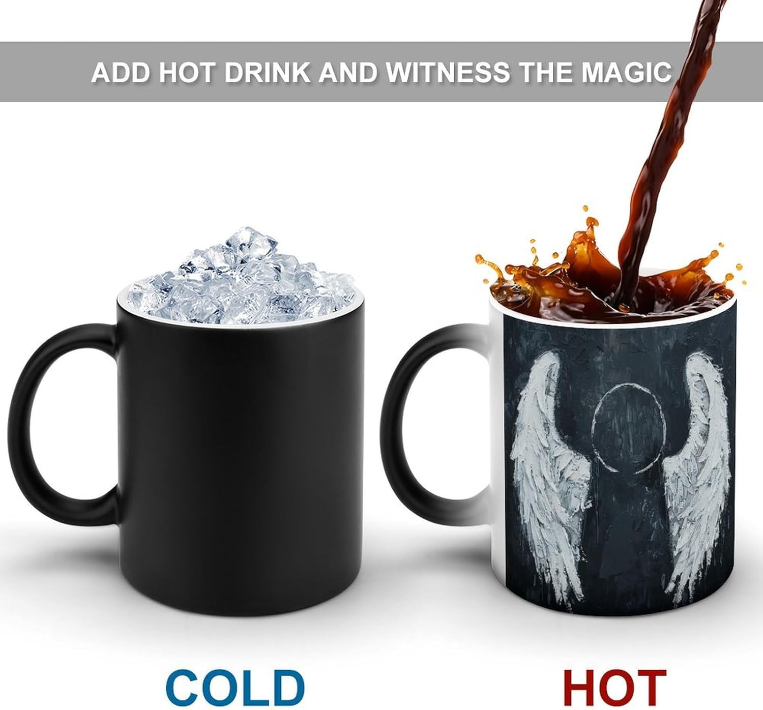 This unique color changing cups is easy to clean, Please scald it with boiling water before using it after receiving it to remove the dust generated during the production process of the cup. It is reusable, Not suitable for dishwashers, only hand wash The White Angel Wings printed reusable color-changing cups are perfect for decorating your kitchen, restaurant or cafe. You can judge whether the coffee is cold by the color of the magic cup, so as to avoid drinking cold coffee