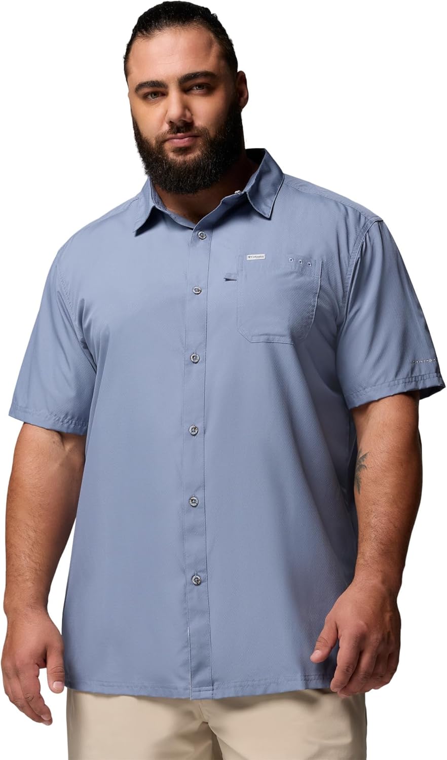 Looking for a shirt that stands up to the sun's glare? You've come to the right place. Columbia Men's PFG Super Slack Tide is a first choice for enjoying a day out on the water and in the sun. The high quality materials used to craft this men's fishing shirt are what make it so special, while its modern classic fit speak to style and comfort. This fishing shirt features Columbia's sun protection technology to help prevent skin damage while outdoors. The material is crafted of UPF 40 to protect against harmful UVA and UVB rays, sunburns, and long-term skin damage. The vented back adds breathability to the shirt to ensure comfort even when things get hot; the 100% polyester fabric is lightweight and dries quickly to keep you cool. Lastly, this short sleeve shirt's chest pocket makes securing your smaller items convenient. Columbia's short sleeve fishing shirt comes in many inclusive sizes and stylish colors. Extended sizing available. Regular Fit. To ensure the size you choose is right, utilize our sizing chart and the following measurement instructions: For the sleeves, start at the center back of your neck and measure across the shoulder and down to the elbow. If you come up with a partial number, round up to the next even number. For the chest, measure at the fullest part of the chest, under the armpits and over the shoulder blades, keeping the tape measure firm and level.